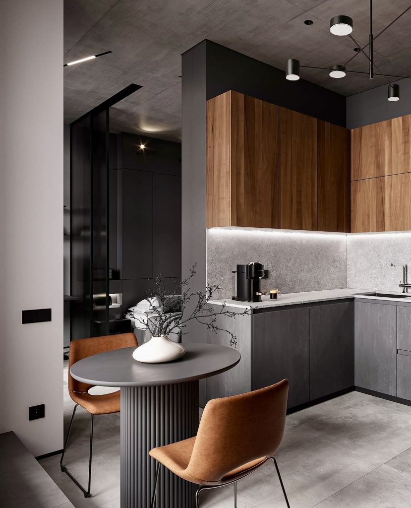 Focusing on sleek lines and refined simplicity, this studio kitchen exudes luxury within a small footprint. Dark cabinetry contrasts with warm wood accents, creating visual balance. A compact dining area comfortably seats two, demonstrating that even limited spaces can accommodate stylish and functional dining. Modern lighting and muted tones contribute to an intimate yet sophisticated atmosphere, perfect for everyday living.