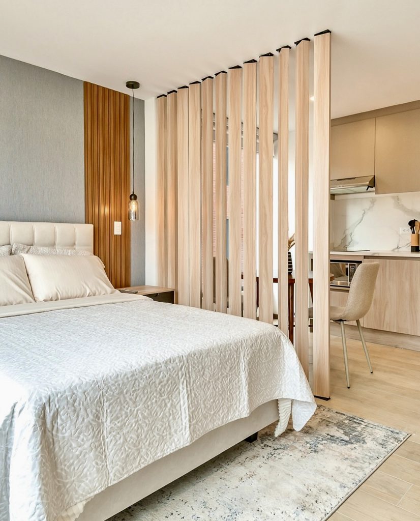 Wooden slat dividers elegantly separate the sleeping area from the kitchen without obstructing light or airflow. This design embodies Scandinavian simplicity with a touch of luxury, creating a bright and cozy environment. Ideal for couples in studios around 450 sq ft, it offers privacy without the confinement of solid walls. This layout prioritizes flow and openness, essential for small-space living.
