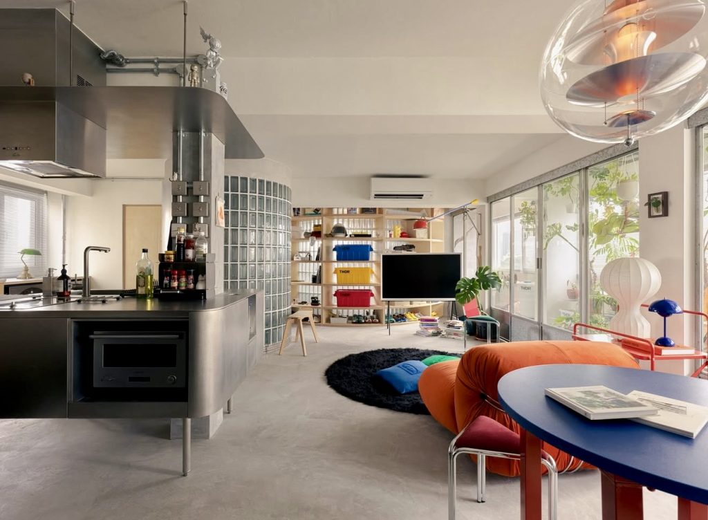 This bold studio blends industrial elements like polished concrete floors and exposed pipes with vibrant colors and playful furniture. Inspired by designers such as India Mahdavi, this “joyful industrial” style infuses grit with personality. In micro apartments around 400 sq ft, multifunctional furniture doubles as art, making the open layout both practical and visually engaging.
