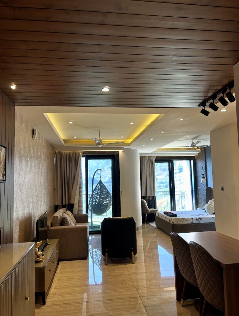 This design channels boutique hotel elegance through layered lighting, glossy floors, and a seamless open plan. Instead of physical dividers, furniture placement and ceiling treatments create distinct zones, lending a spacious luxury feel. Perfect for two sharing a 500 sq ft studio, it emphasizes comfort without clutter. Features like quilted chairs and a balcony with a hanging chair evoke resort-style living, demonstrating that small spaces can be indulgent.