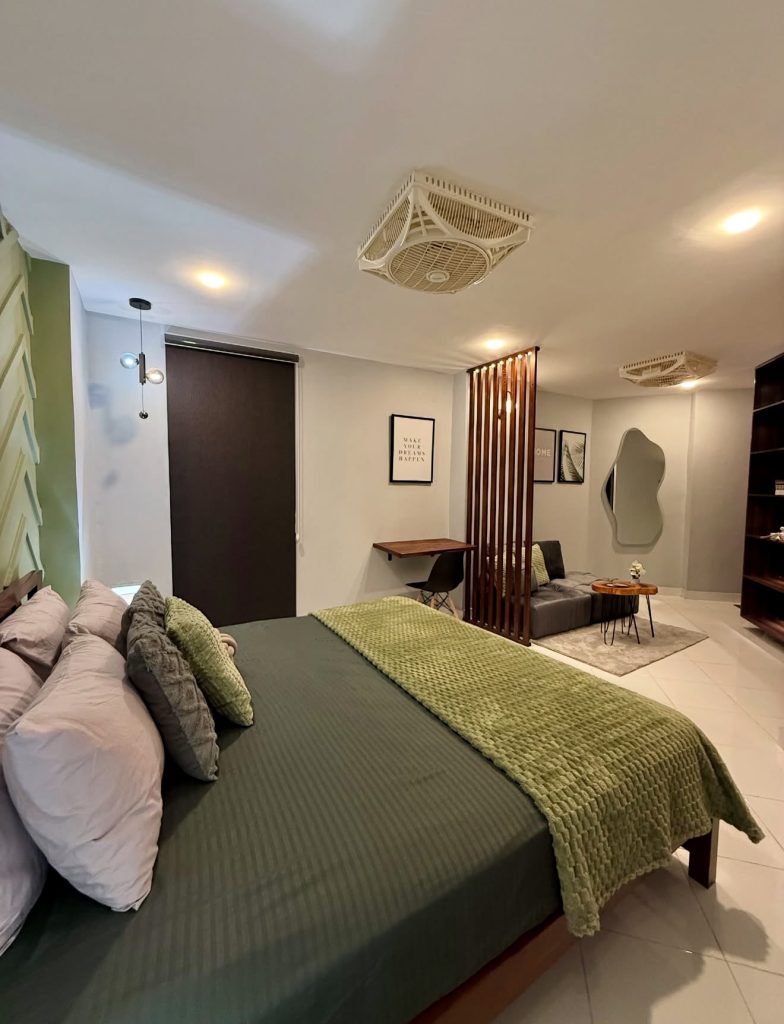 A slim wooden divider subtly separates the sleeping area from the lounge, grounding the space with deep green bedding for a cozy vibe. This layout is especially effective in basement studios with lower ceilings, where vertical slats add structure without closing off the room. Incorporating wall-mounted lamps and floating desks saves floor space, creating a functional environment for two without clutter.