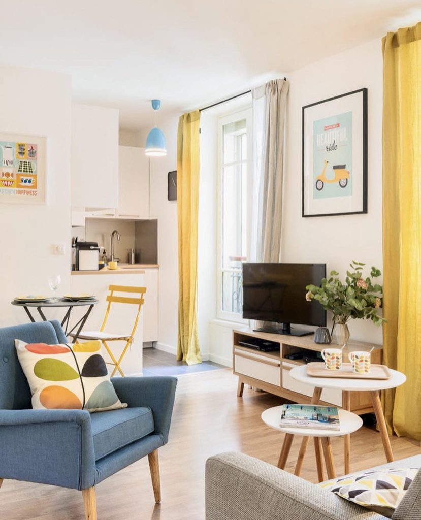 This Scandinavian-inspired studio proves that even 400 to 450 sq ft homes can be lively and stylish with a thoughtful color palette. The kitchen occupies one corner, complemented by a compact dining nook, maximizing the open layout. Pops of yellow and blue energize the space, while simple furniture pieces keep it light and airy. This design is perfect for young professionals seeking an affordable yet personality-filled home.