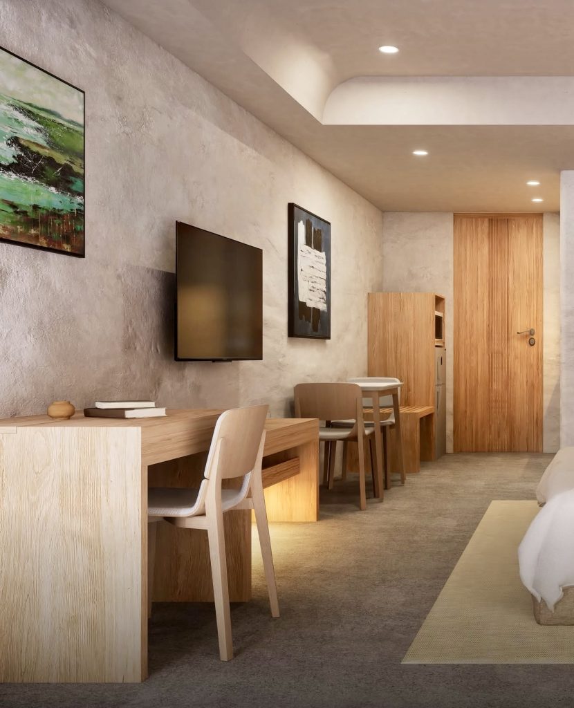 Featuring natural wood and subtle lighting, this studio creates a luxurious ambiance within a small footprint. A built-in desk and dining table form a continuous surface, an excellent solution for 500 sq ft apartments. Thoughtful material choices like stone-textured walls and warm woods transform a bare space into an elite retreat. This design appeals to those who appreciate silent minimalism and efficient use of every square meter.