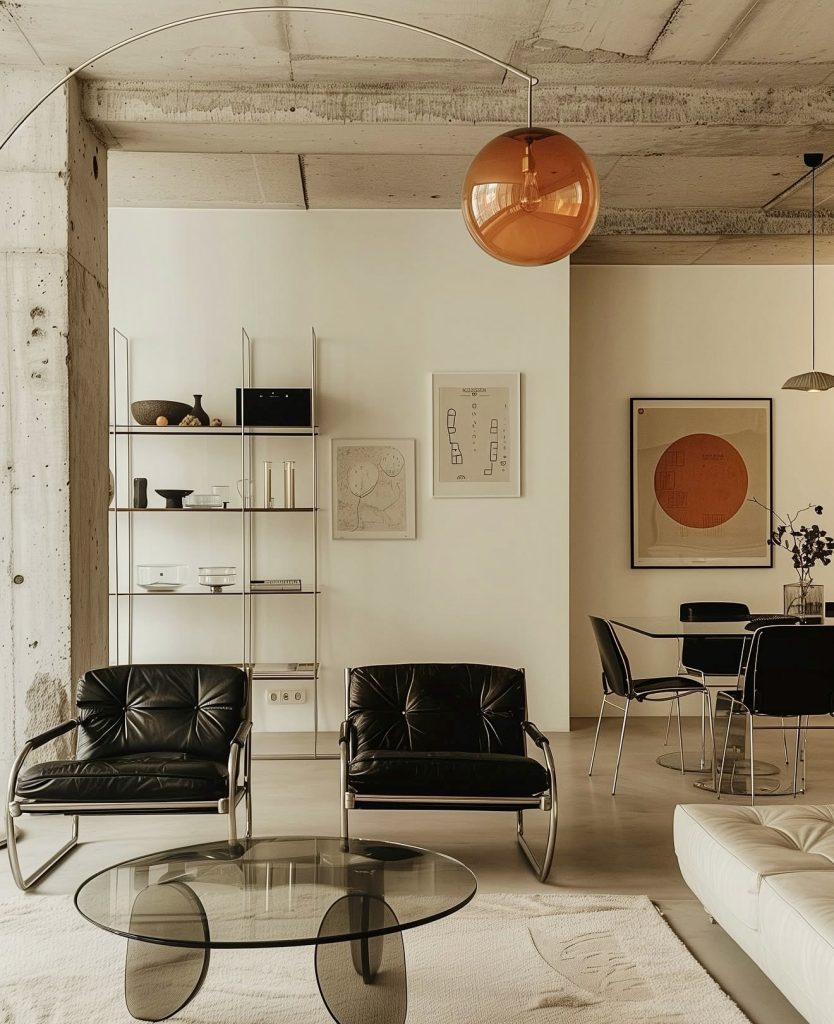 This design fully embraces industrial aesthetics with exposed concrete and sleek black furniture, balanced by warm lighting and curved accents like an orange globe lamp. The layout keeps seating and dining on one side, leaving the other side open for flow. Perfect for studios around 400 to 450 sq ft, this style reflects recent European trends that combine bold structures with softer details.
