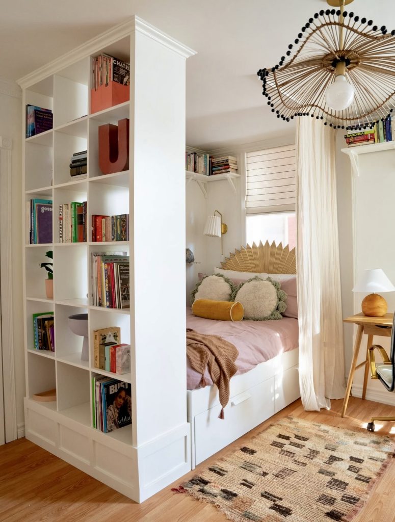 Utilizing a tall shelving unit as a room divider cleverly carves out a snug sleeping alcove within a compact corner. This design merges book storage with a bed featuring built-in drawers, illustrating that even limited spaces can be highly functional. The combination of warm wood flooring and a plush rug introduces an inviting, earthy ambiance. Ideal for apartments around 500 sq ft, this approach creates separation without erecting walls, maintaining a personalized and welcoming atmosphere.
