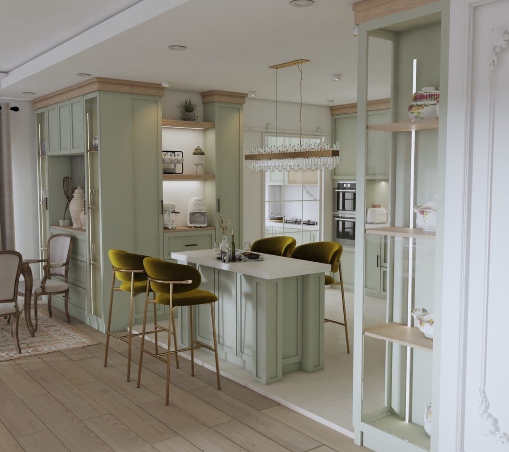 Blending practicality with elegance, this kitchen showcases the artistry of craftsmanship paired with a calming palette. Pale sage cabinetry accented by natural wood trim evokes the serene ambiance of a French countryside home, while plush olive velvet barstools and a sparkling crystal pendant elevate the space to villa-worthy luxury. The design harmonizes classical elements like open shelving and brass hardware with modern functionality, making it a dream for those who appreciate beauty alongside usability.