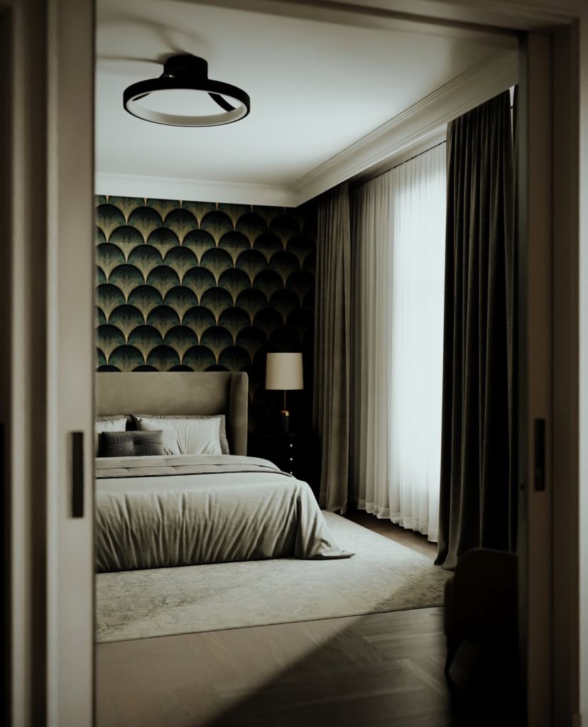 Dark, dramatic, yet soothing, this bedroom marries neoclassical grandeur with soft textures to create a peaceful retreat. The fan-patterned accent wall adds depth without overwhelming the space, while velvet drapes and a tufted headboard soften the overall atmosphere. Neutral bedding maintains a calming vibe, allowing the room’s architectural symmetry and tactile surfaces to shine. This is a luxurious haven designed for rest and rejuvenation in style.