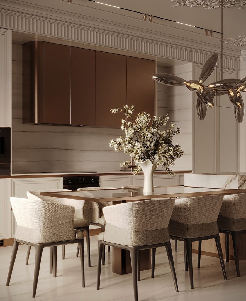 In this dining room, classic design meets contemporary flair to create an inviting yet sophisticated atmosphere. Sleek cabinetry and polished marble surfaces are balanced by sculptural lighting, a vibrant floral centerpiece, and high-backed upholstered chairs. The contrast between smooth furniture finishes and warm metallic cabinetry adds a subtle edge, making this space perfect for both lively gatherings and intimate dinners. It’s a testament to how neoclassical design can seamlessly integrate into modern lifestyles.