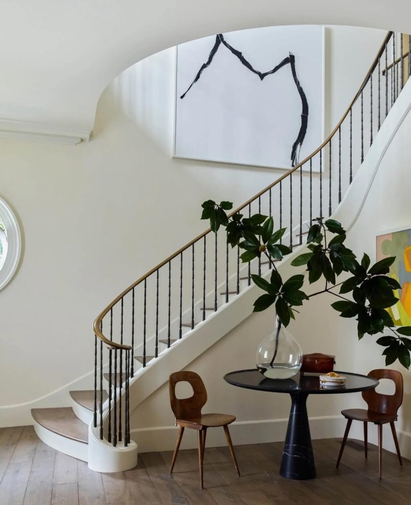This impressive foyer reinterprets classic grandeur for a residential setting, featuring a sweeping white staircase with delicate iron balusters and a slender wooden handrail. A round dark table anchors the space, complemented by mid-century wooden chairs and a commanding oversized plant. The abundant abstract artwork injects personality, blending tradition with bold character—ideal for homes with formal yet intimate entryways.