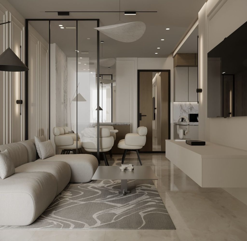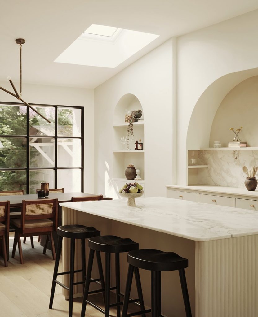 This space distills neoclassical design to its purest form, emphasizing arches, marble, and a soft neutral palette. The kitchen and dining areas feature classical shapes, including a fluted island base and recessed niches, while natural light from a skylight bathes the creamy tones, giving the room a gallery-like ambiance. Black stools and window frames introduce modern contrast, proving that even compact spaces can embody luxurious architectural rhythm.