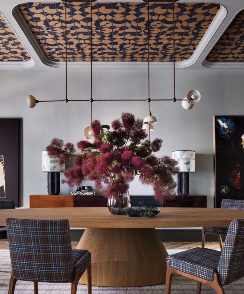 This dining area boldly combines neoclassical structure with mid-century and contemporary influences. A geometric textile ceiling installation adds rhythm and drama overhead, while a vibrant floral centerpiece anchors the space. Plaid-upholstered chairs, warm wood tones, and ceramic lamps nod to retro design but feel thoroughly modern here. This restaurant-quality setting celebrates mature color schemes and rich textures, ideal for festive meals or creative gatherings.