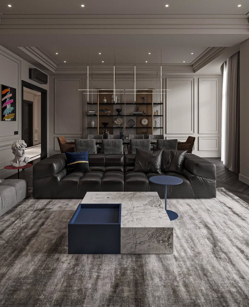 Dark and moody, this living room exemplifies how neoclassicism thrives in a monochromatic palette. A marble and navy coffee table complements black leather modular seating, while strict wall paneling, a suspended sculptural chandelier, and curated shelf displays establish architectural rhythm and intellectual sophistication. The blend of wood elements and refined lighting creates an atmosphere-driven space that prioritizes mood over mere style.