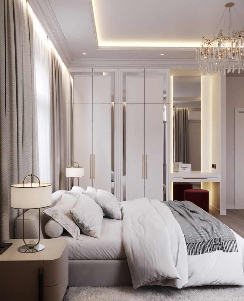 This elegant bedroom highlights the gentler side of neoclassical interiors, where layered lighting and precise symmetry foster a serene ambiance. Tall mirrored wardrobe panels enhance verticality, while crown molding and recessed lighting softly illuminate architectural details. Satin finishes, sleek bedside tables, and a velvet-covered vanity stool evoke the charm of a boutique hotel, ideal for those who favor minimalist bedrooms with a romantic touch.
