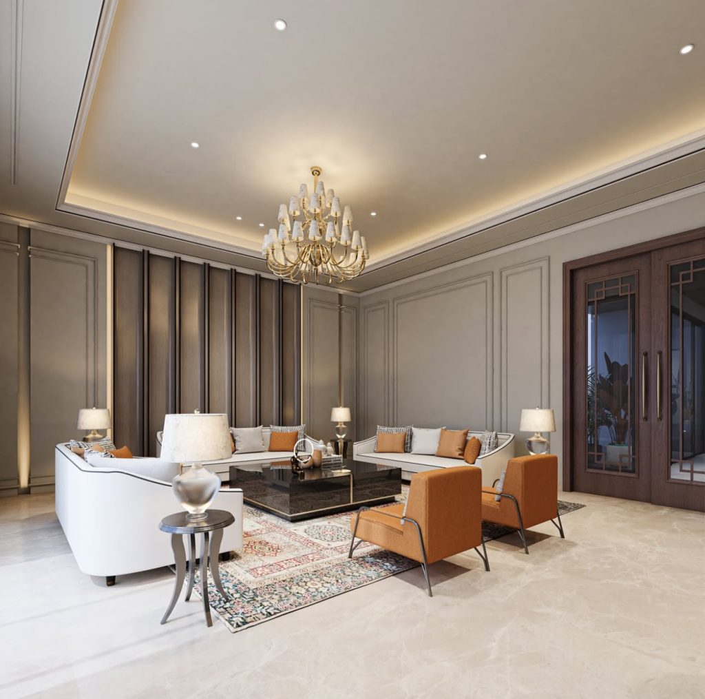 Defined by traditional paneling, a stunning chandelier, and a harmonious palette of cream, walnut, and terracotta, this living room exudes villa-level luxury. Classical carved moldings blend with contemporary furniture silhouettes, including structured sofas and retro lounge chairs, creating a welcoming yet sophisticated seating arrangement. A Persian rug adds historic richness, while layered lighting enhances warmth, making this space perfect for both intimate and formal gatherings.