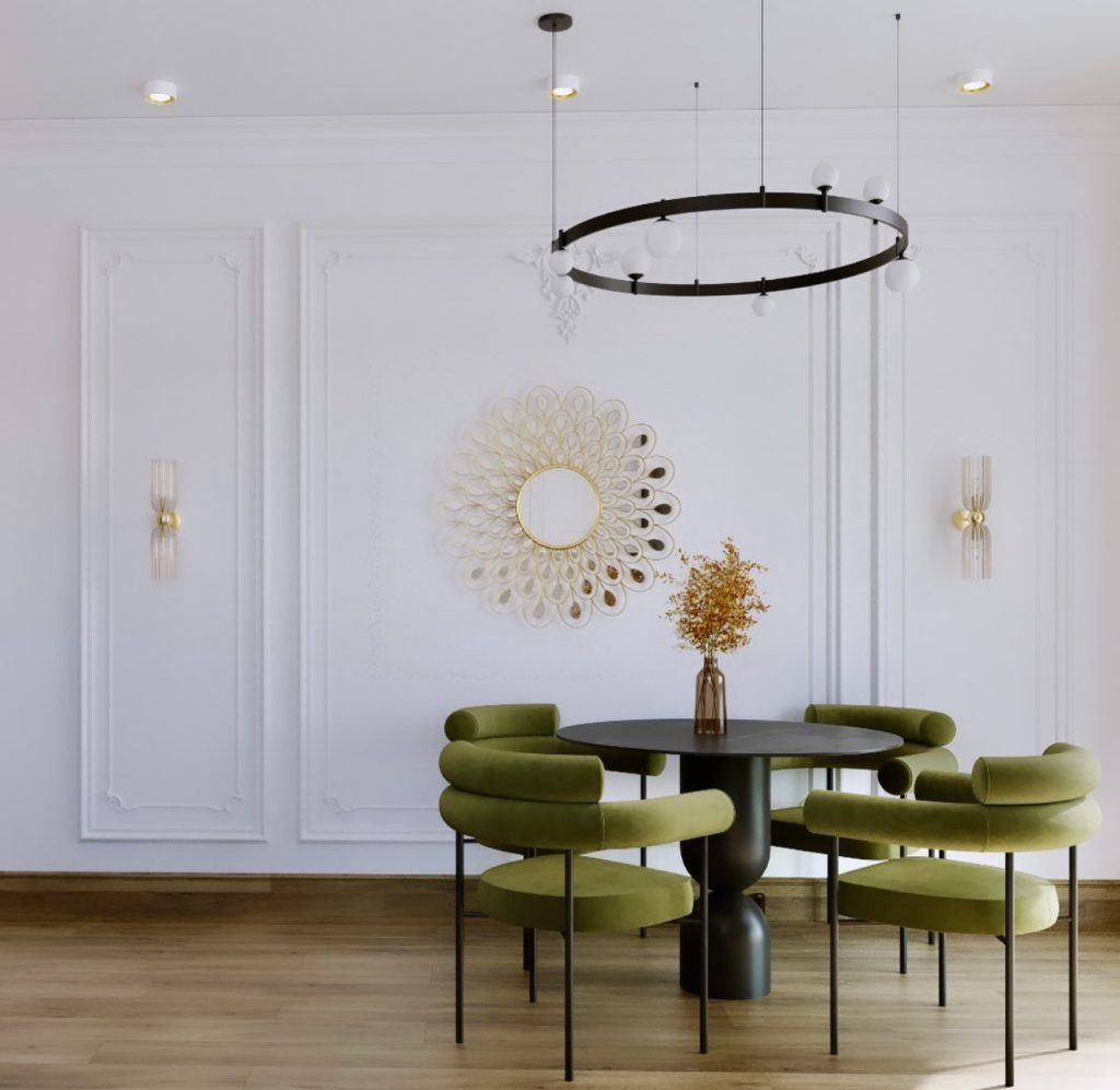 Bright and inviting, this dining room demonstrates how neoclassical elements can feel fresh and playful. Delicate wall paneling and a round gold mirror introduce traditional architecture, while olive velvet chairs add a modern touch of sophistication. A matte black pedestal table and a round chandelier create a cozy symmetry, making this an ideal setting for intimate gatherings and a prime example of tasteful small dining room decor.