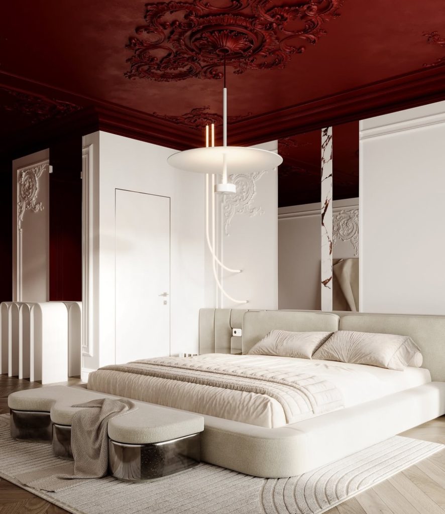 This bedroom challenges traditional neoclassical norms by concentrating ornamental detail on the ceiling. Deep oxblood red molding draws the eye upward, infusing the space with drama and emotion. Complemented by a platform bed, cream-toned fabrics, and sculptural lighting, the room balances bold decoration with minimalist calm, offering a Hollywood-inspired take on bedroom luxury.