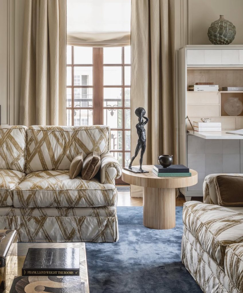 This richly textured living area evokes the charm of a refined study, featuring tufted sofas draped in graphic textiles and anchored by a deep blue rug. Linen-draped windows flood the room with soft light, while statuary and antique books add an artistic narrative. The inviting atmosphere reflects a warm, lived-in luxury that appeals to those who cherish heritage with personality.