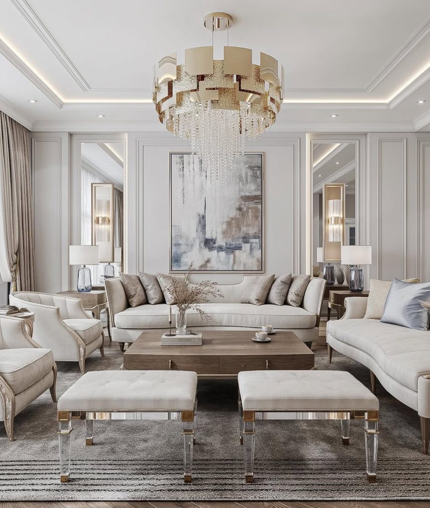 Symmetry, formality, and radiant luxury define this living room, highlighted by a cascading crystal chandelier and reflective metallic seating finishes. Classic wall paneling and architectural details are balanced by monochrome furniture and glass-accented stools. The muted palette, dim lighting, and velvet fabrics create a sophisticated, editorial ambiance.