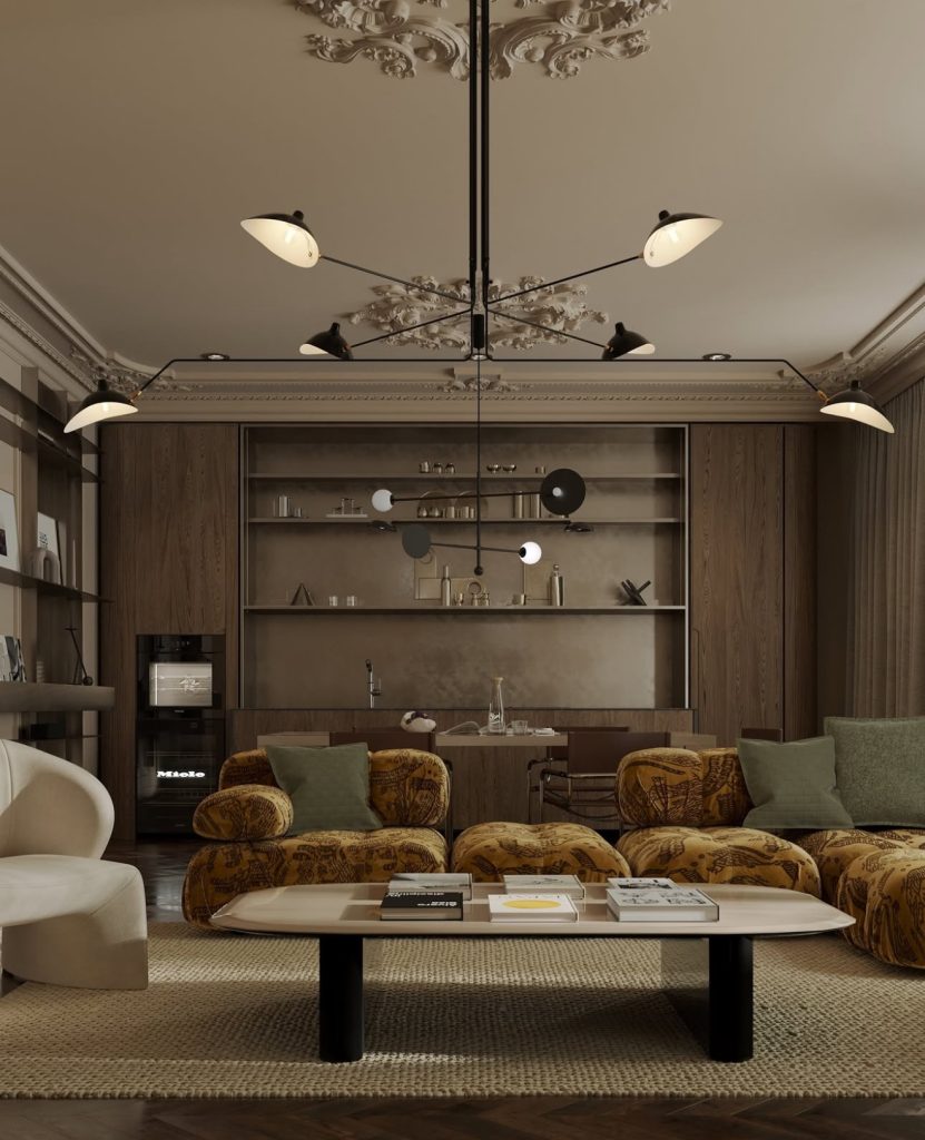 This earthy, atmospheric lounge reimagines the living room as a cozy yet opulent retreat. Ornate ceiling moldings frame a contemporary branched chandelier, while tapestry-like seating adds texture and warmth. Wooden paneled shelves and a simple bar area create an inviting space perfect for entertaining or unwinding. This design proves that neoclassicism can embrace rich textures and earthy tones without sacrificing elegance.