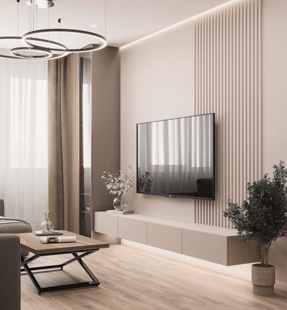 This space offers a flawless fusion of minimalist living with subtle neoclassical touches. Fluted wall panels, muted tones, and geometric lighting create a sophisticated interplay of weight and lightness. Rounded sofas, sculptural chairs, and a streamlined floating media console deliver a contemporary look where architectural symmetry ensures timeless appeal. It’s a prime example of how minimalist TV wall installations can be both fashionable and straightforward.