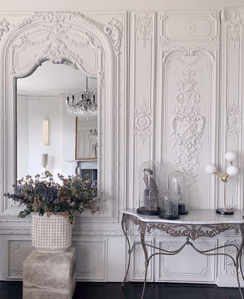 Few features evoke neoclassical grandeur like walls adorned with sculptural reliefs and decorative framing. This baroque-inspired room radiates French glamour, featuring a grand mirror and cast-iron console table that elevate the space into a luxurious vestibule. Antique finishes paired with dim lighting create a curated, museum-like atmosphere, perfect for lovers of architectural history and dramatic decor.
