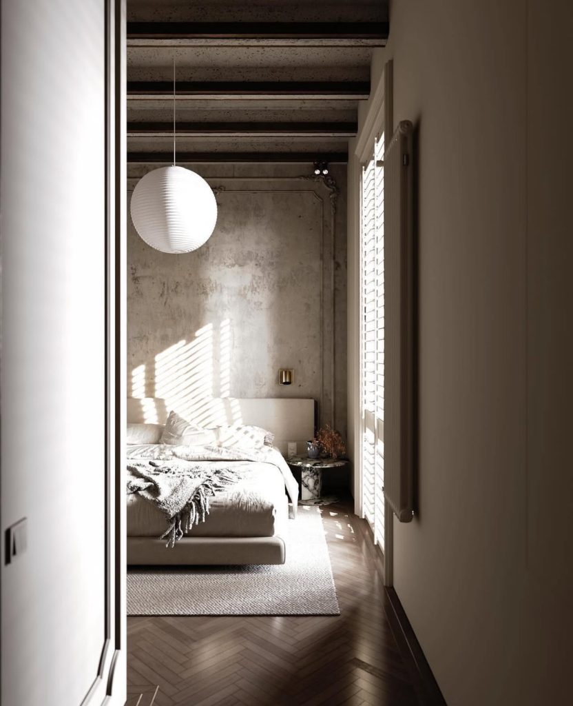 This inviting bedroom combines rustic minimalism with neoclassical influences. Exposed wooden beams and understated wall decor ground the space in classicism, while pared-down furniture and a moody ambiance bring a modern edge. A subdued color scheme and natural materials—from bedding to stone nightstands—enhance the relaxing vibe. This room exemplifies minimalist bedroom aesthetics enriched with historical warmth.