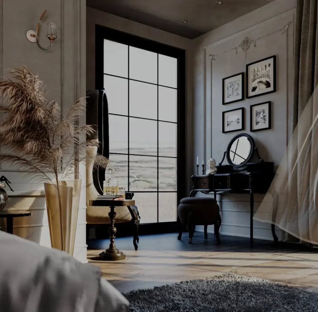 Evoking cinematic romance, this bedroom features black-framed windows and soft drapery that set a luxurious tone. Intricate moldings and classical wall decorations blend effortlessly with antique-style furniture like a vanity and accent tables. Warm lighting and carefully chosen accessories create an inviting atmosphere where old-world drama and modern comfort coexist beautifully.