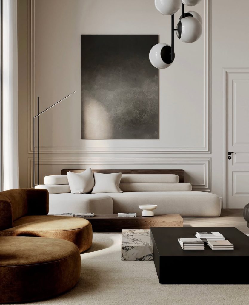 This luxurious living room perfectly captures the spirit of contemporary neoclassicism—minimalist in form yet rich in detail. The interplay of soft, neutral upholstery, geometric lighting fixtures, and opulent wooden accents creates a dynamic balance between visual interest and refined aesthetics. Architectural textures emerge through layered wall paneling, while the gentle curves of brown armchairs provide a warm contrast to the otherwise monochrome scheme. This space exemplifies a sophisticated standard of living that values equilibrium, movement, and visual weight without excess.