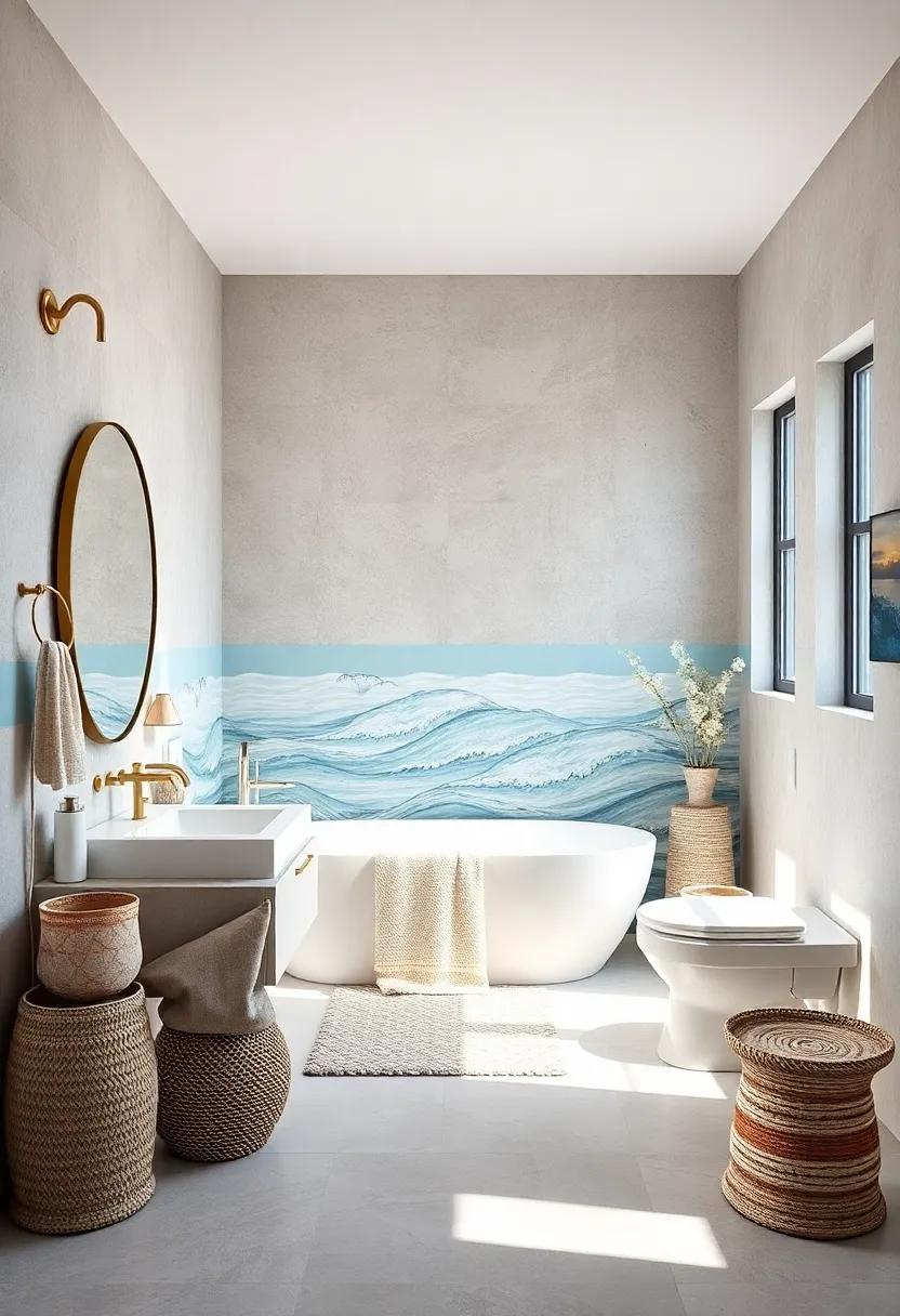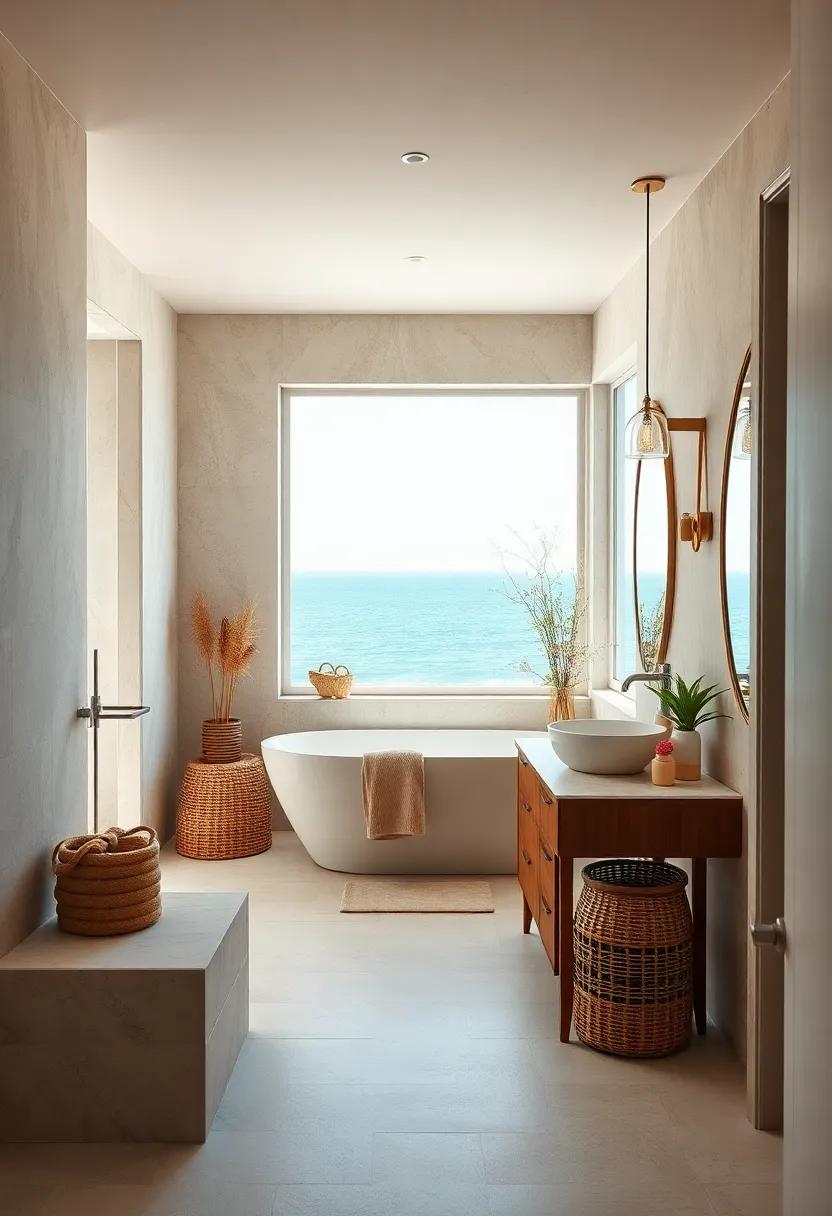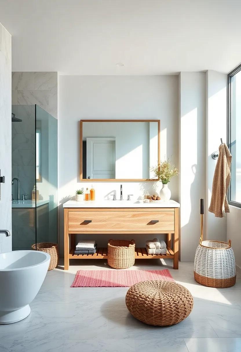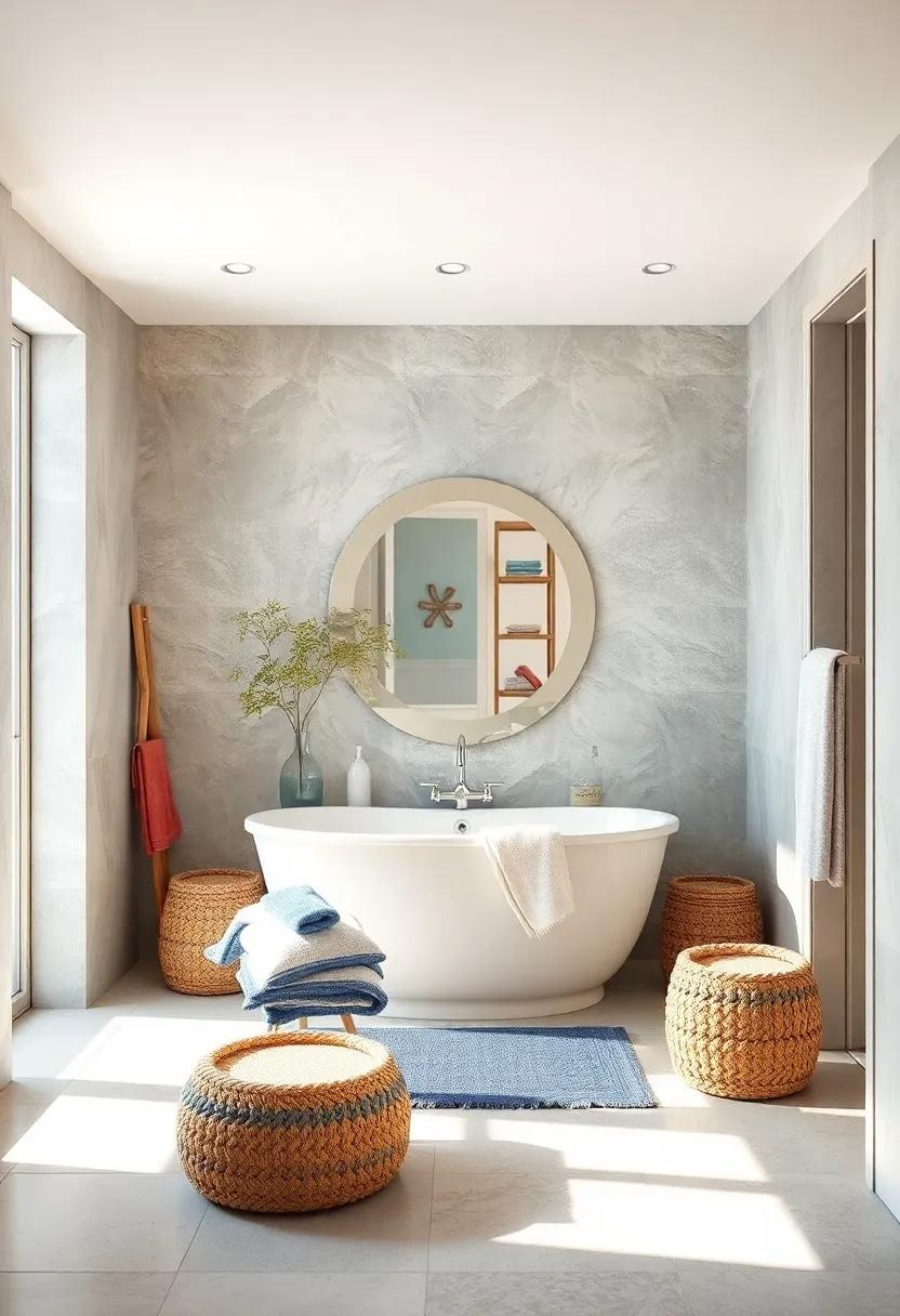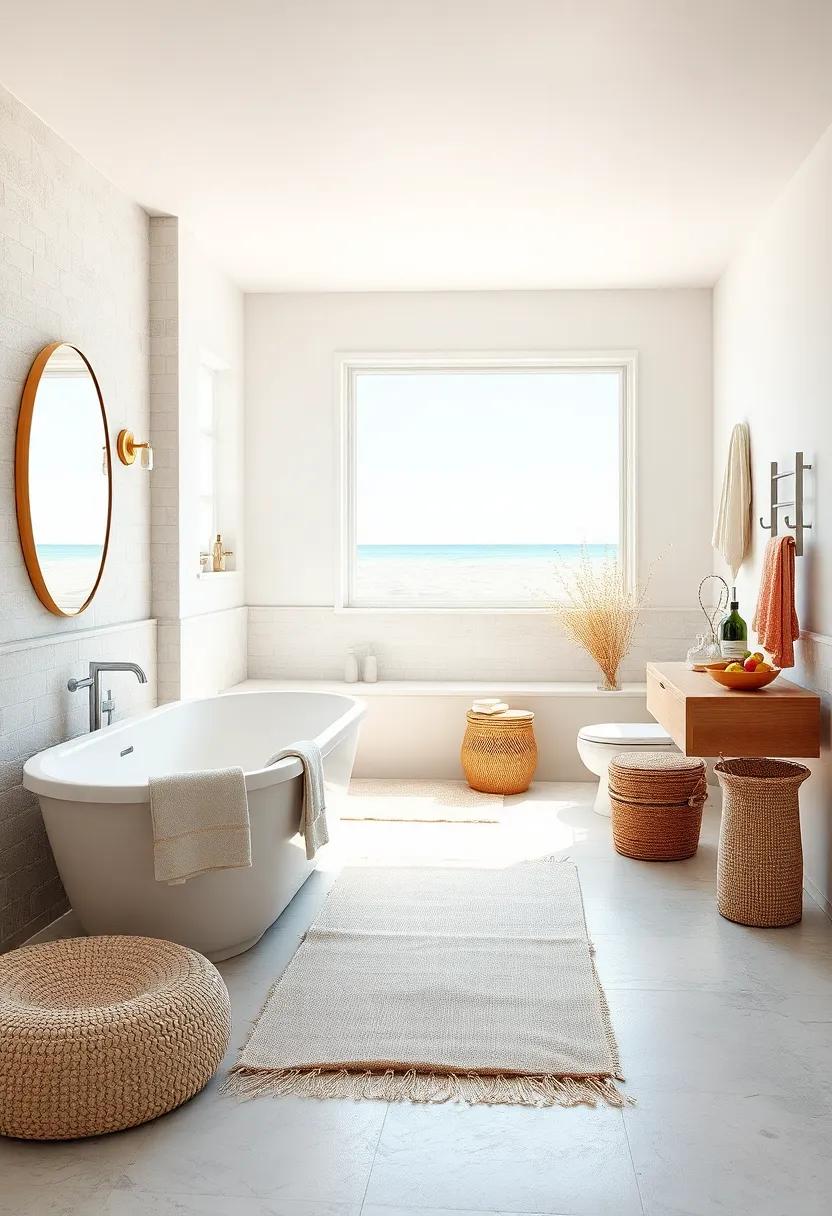 Feature Woven Baskets: Add texture and organization with stylish woven baskets for storing towels and toiletries, perfect for that beachy vibe