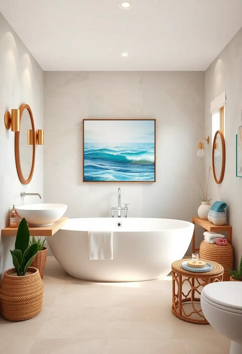 Transform your bathroom into a tranquil coastal retreat by incorporating beach-inspired art that captivates the senses. Consider pieces that reflect the soothing hues of the ocean,such as soft blues,sandy beiges,and crisp whites. You can opt for vibrant abstract paintings that mimic the movement of waves or stunning coastal photography featuring pristine beaches at sunset. These visuals not only draw the eye but also create a peaceful ambiance, making every bath feel like a luxurious escape.
