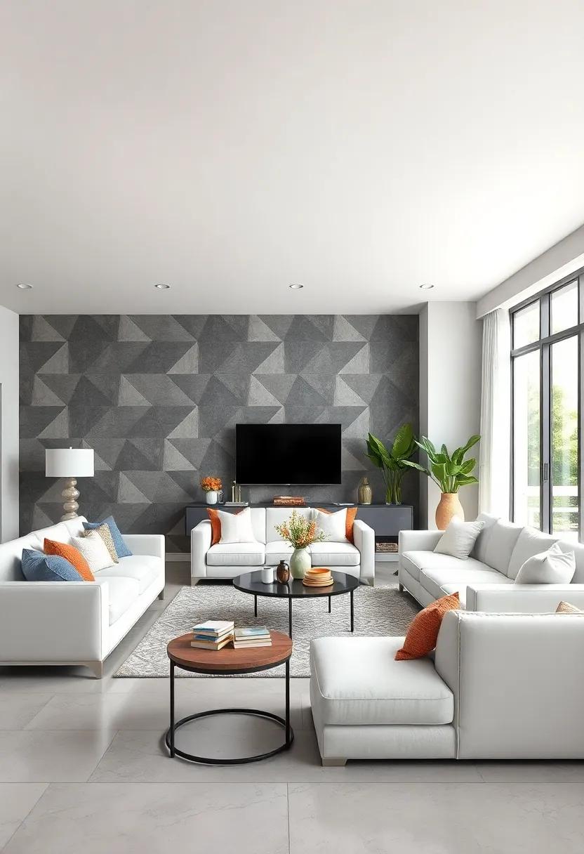 Embrace Modern Elegance: A spacious gray living room adorned with oversized geometric wallpaper sets a contemporary tone, while crisp white furniture creates an inviting oasis