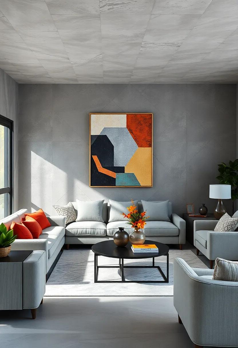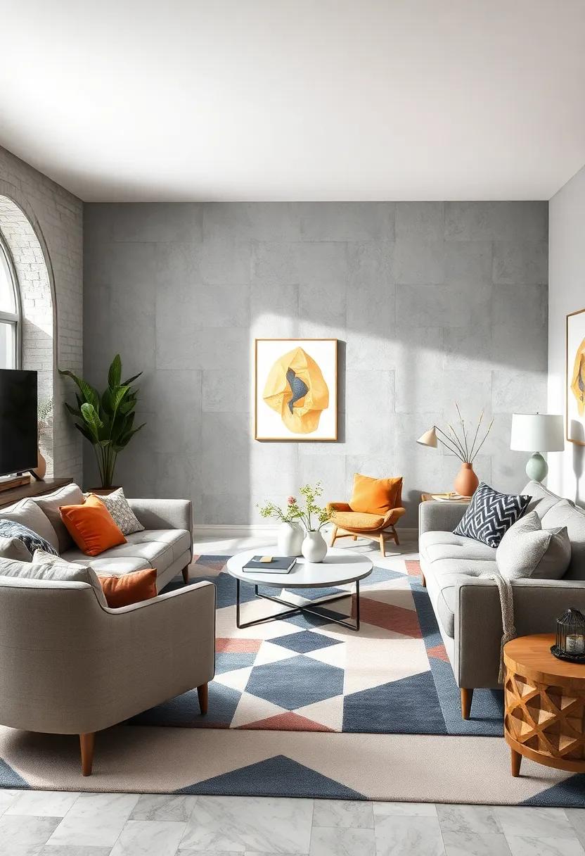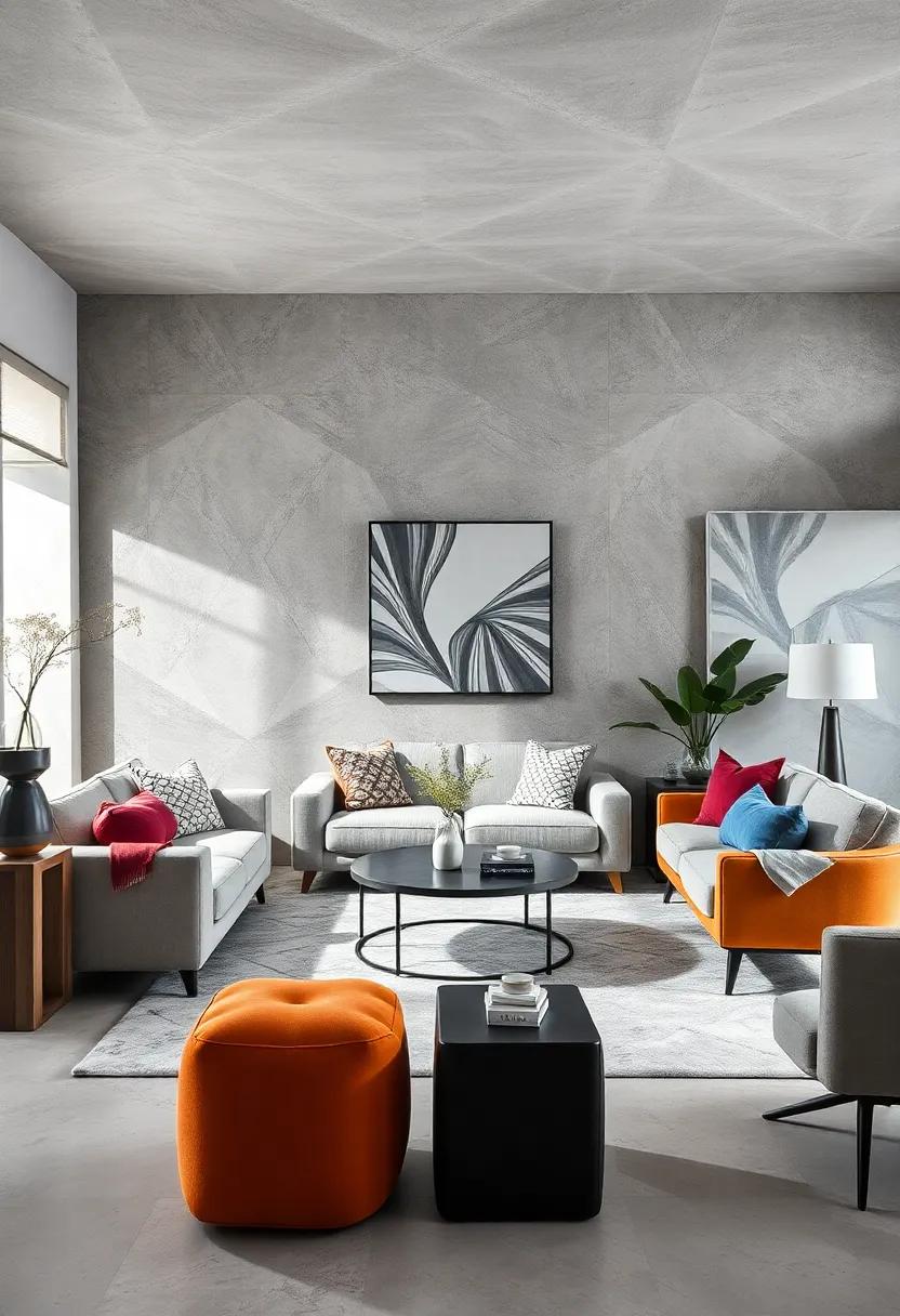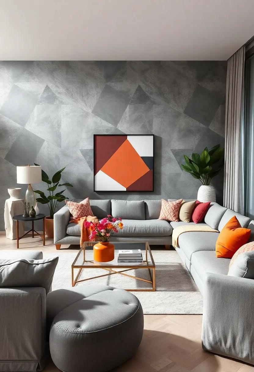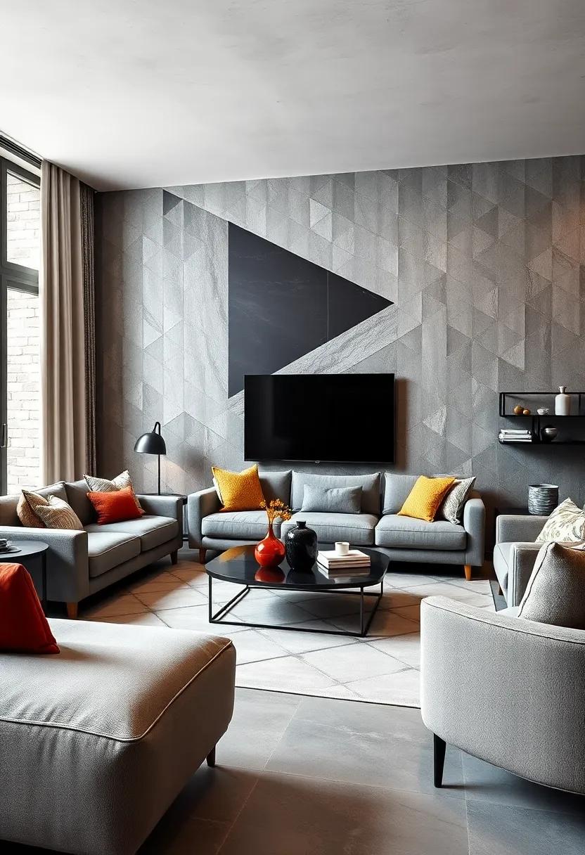 Artistic Layers: Textured gray walls serve as a canvas for layered geometric art pieces in this dynamic living room, showcasing creativity and individuality in design