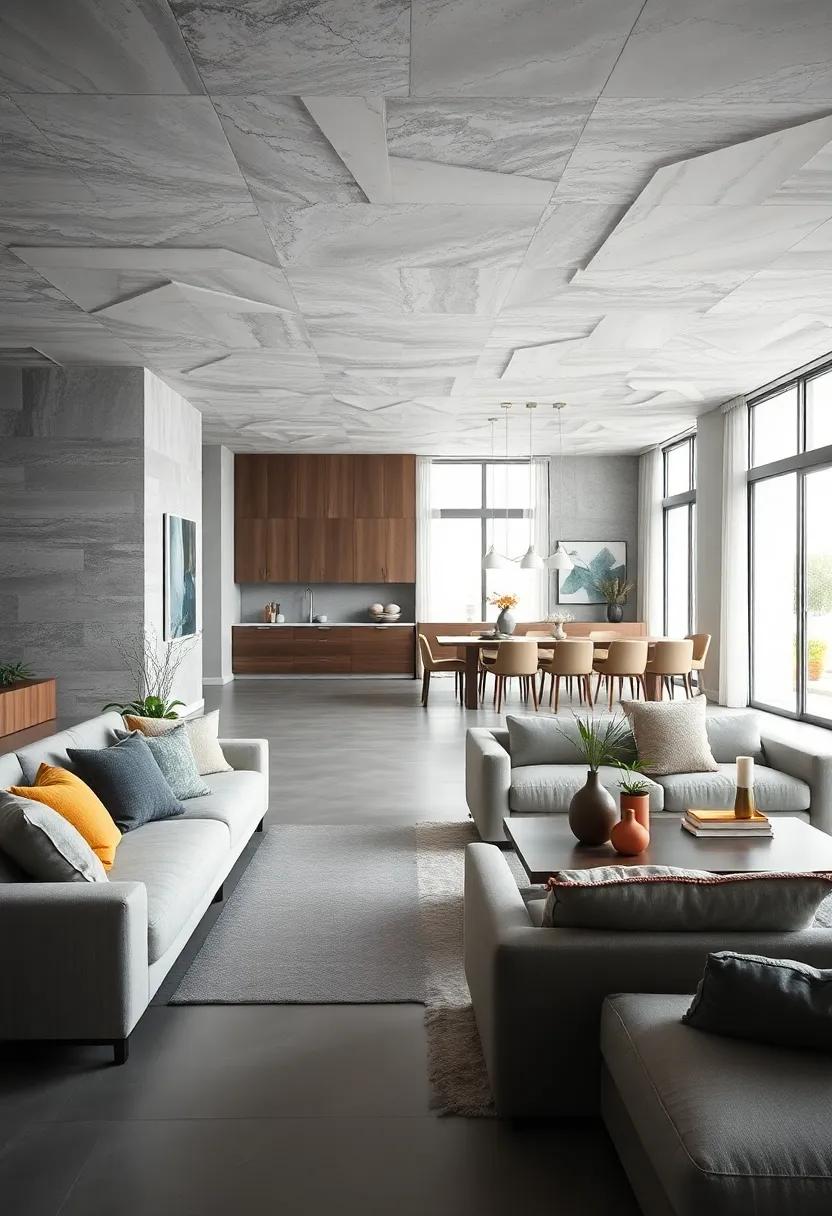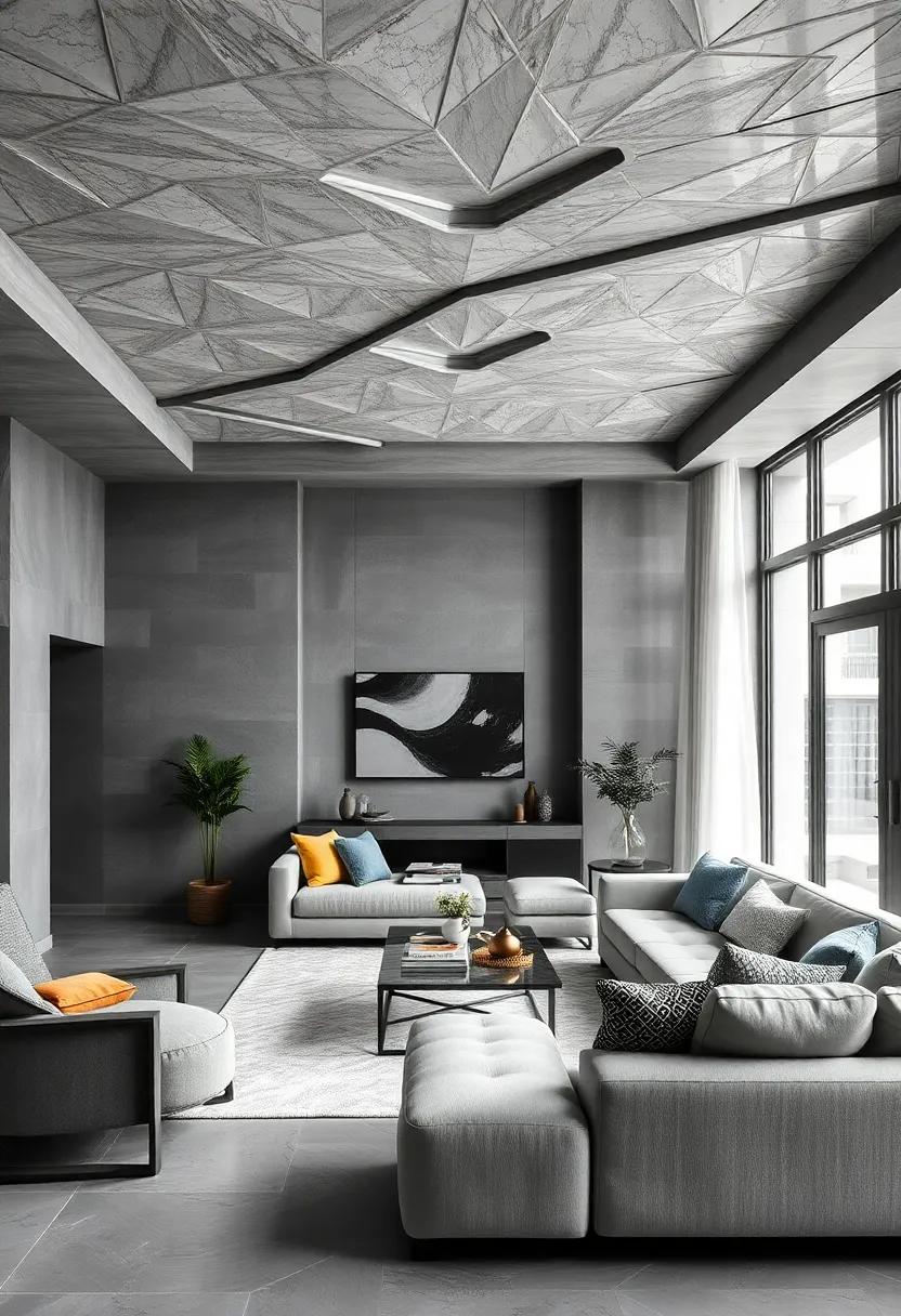 Imagine walking into a living room where the ceiling takes center stage, captivating every guest’s attention. A dramatic gray palette enhances the subtle sophistication of the space, while the geometric ceiling design adds an element of surprise and intrigue. This unique architectural feature not only elevates the aesthetic but also creates a play of shadows and light that transforms the entire room. From sleek angular lines to intricate tessellations, the ceiling becomes a canvas that draws the eye upward, inviting admiration for both its artistry and the craftsmanship involved.