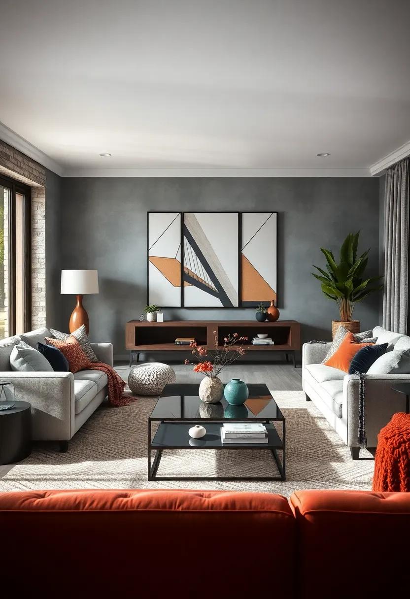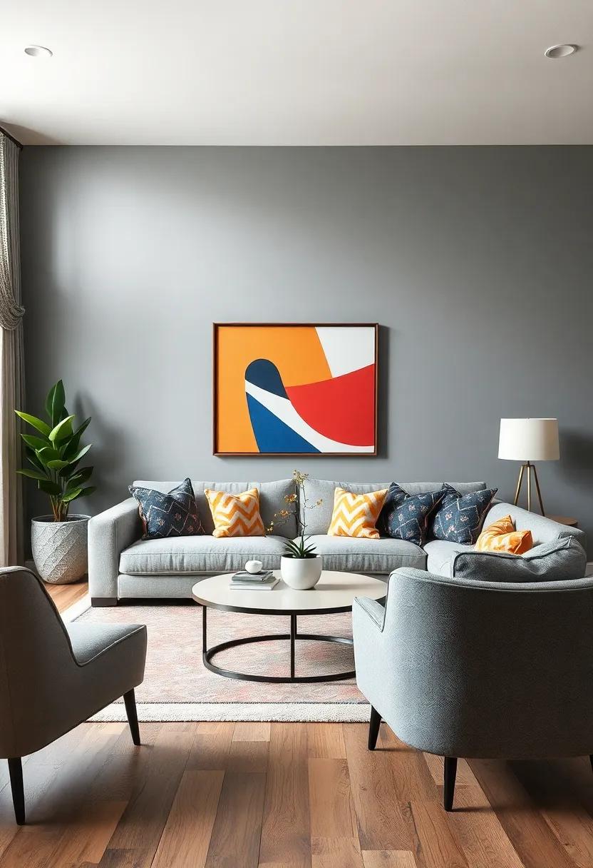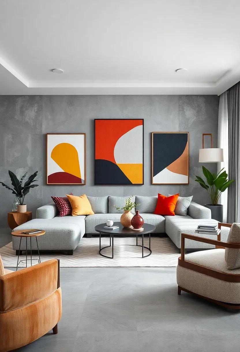 Imagine stepping into a living room that feels like a curated art gallery, where every corner exudes creativity and boldness. The gray backdrop acts as a perfect canvas, allowing bold geometric art pieces to take center stage. Shapes in vibrant hues clash and collaborate, creating a striking visual dialog that enlivens the space. Subtle textures in the gray upholstery further enhance the aesthetic, providing a harmonious balance to the sharp lines and contrasting colors of the artwork. Hanging a large, eye-catching piece above the fireplace or a sleek console table can create a stunning focal point that draws the eye, while smaller prints can be arranged in salon-style on a nearby wall for a more eclectic feel.