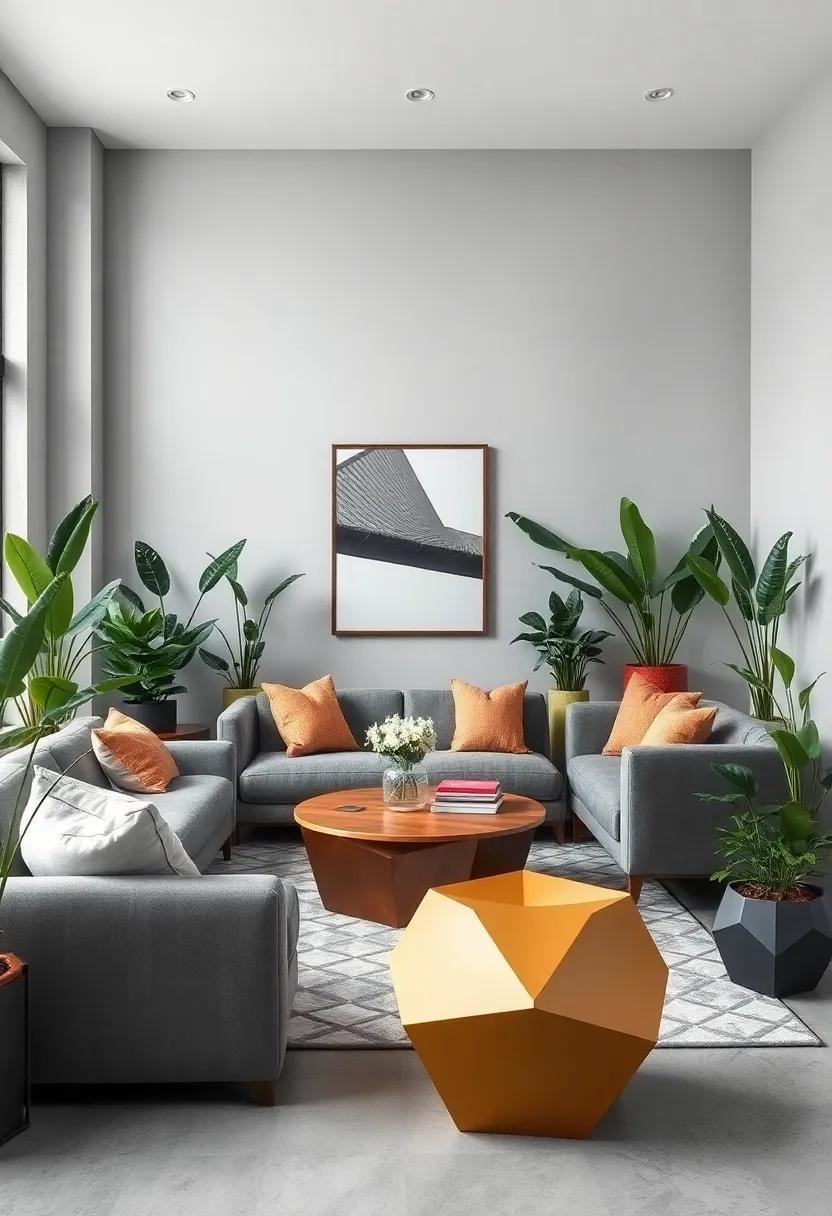 Statement Furniture: Bold geometric furniture pieces alongside a neutral gray backdrop can instantly elevate a living room’s style, making it both functional and fashionable
