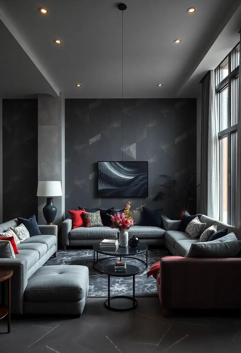 Accessorizing this kind of living room becomes an art in itself.Think of incorporating metallic accents—like brass or silver coffee tables—to break up the darkness and add a splash of brilliance alongside the gray. Layering different fabrics,such as a chunky knit throw over a sleek leather sofa,enhances the visual intrigue. Below, an array of well-chosen plants keeps the atmosphere fresh, introducing a subtle burst of greenery that works beautifully with the bold geometric motifs and the rich color palette. The result is a sumptuous sanctuary tailored for those who revel in depth and style.