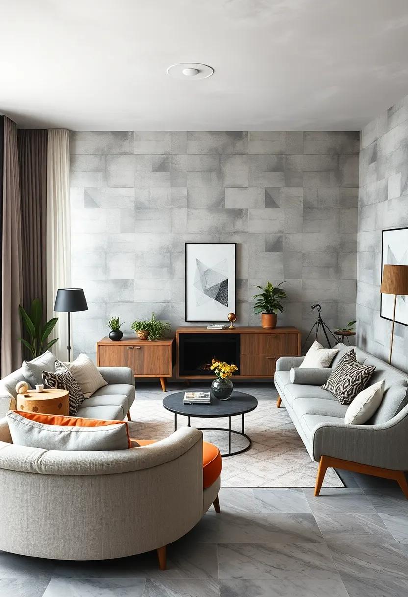 Vintage Flair: A charming gray space adorned with retro geometric wallpaper and mid-century furniture creates a nostalgic yet fresh vibe that’s perfect for vintage enthusiasts