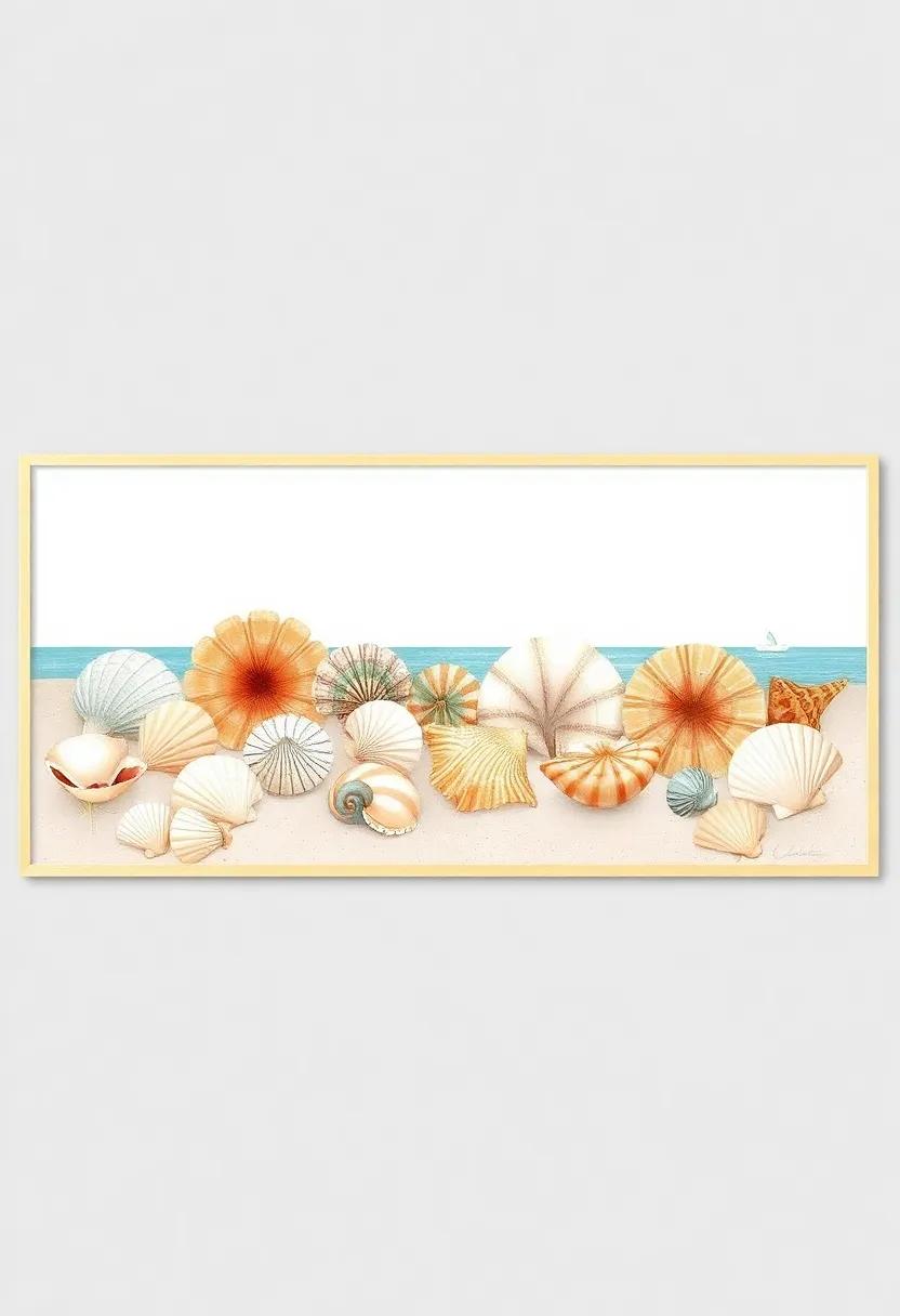 The intricacy of the shell designs, ranging from the muted tones of a sand dollar to the striking patterns of a tiger cowrie, provides a delightful visual feast. Each shells’ unique shape and pattern can inspire a range of decor elements, whether it be in the form of decorative vases filled with real sea glass or a curated bookshelf with ocean-inspired books.Consider complementing this artwork with textured fabrics in sandy hues, natural wood accents, or even subtle metallic touches to enhance the coastal theme. With the right arrangement, every glance at this charming wall art will transport you back to tranquil seaside escapes.