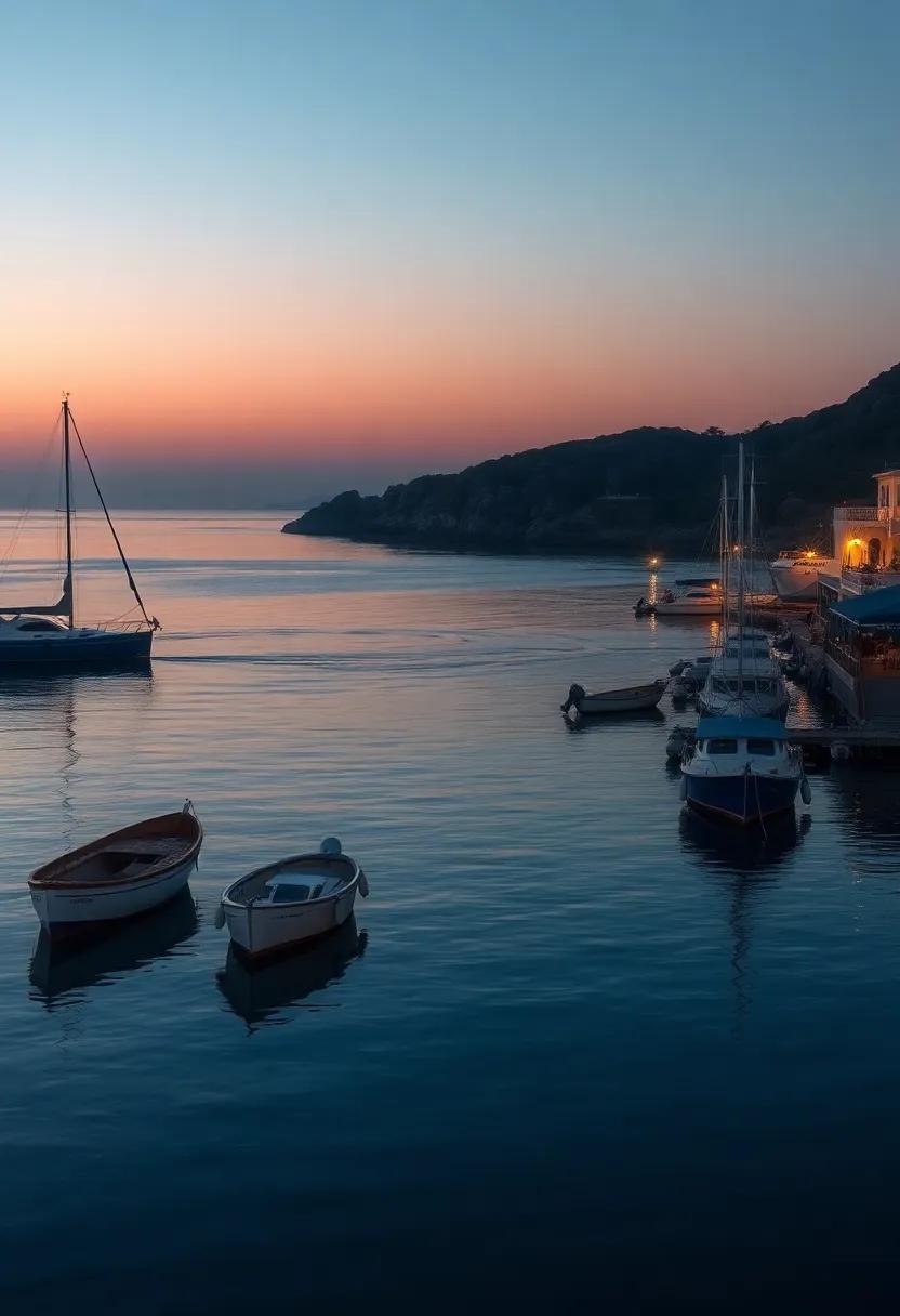 “Harbor Lights”: A tranquil scene of a harbor at dusk, with glowing lights reflecting off water, perfect for adding a romantic touch to dining spaces