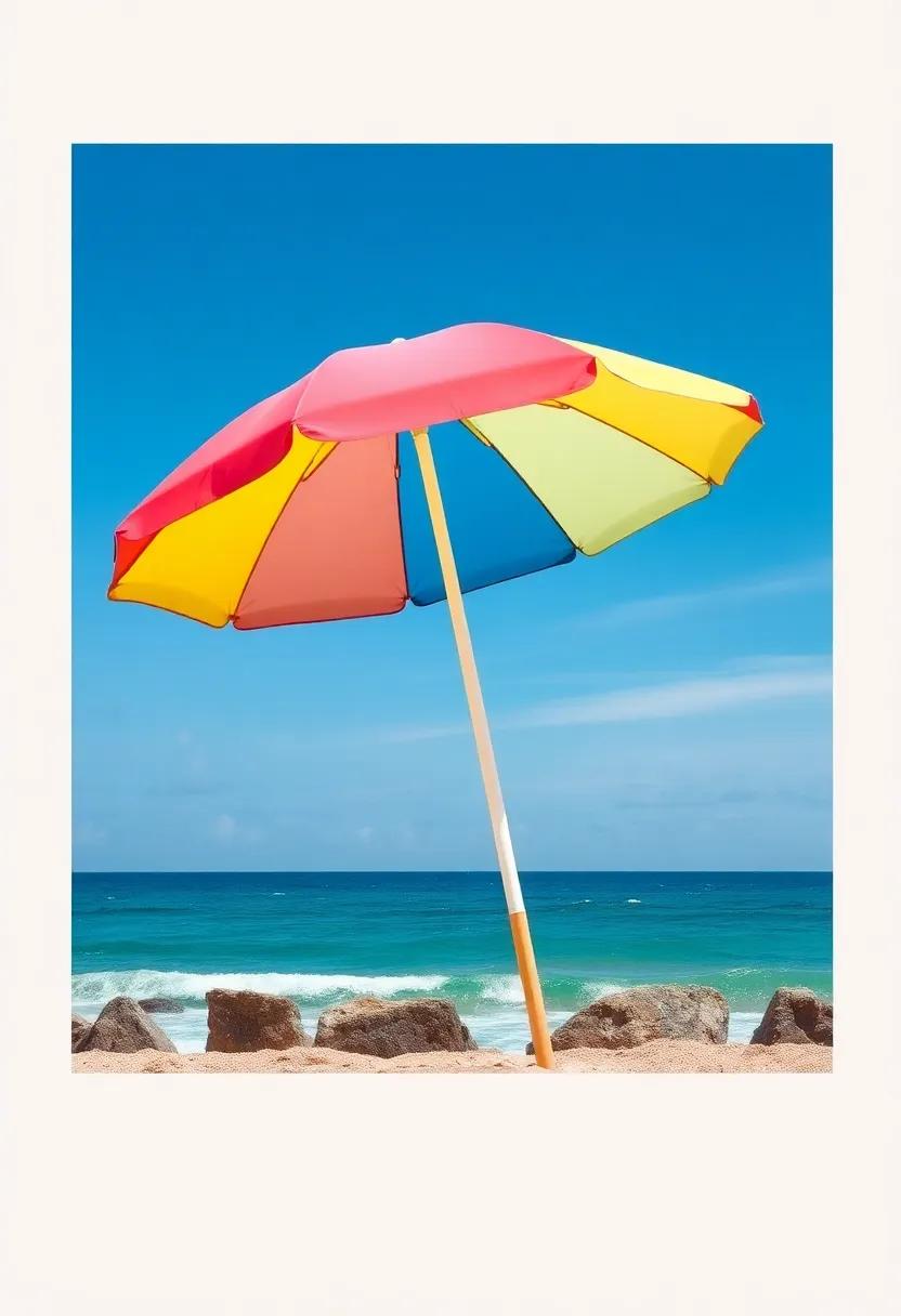“Breezy Beach Umbrella”: A colorful portrait of a classic beach umbrella swaying in the breeze, evoking carefree summer days spent by the ocean