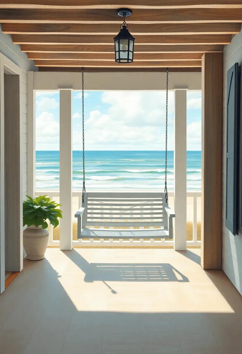 “porch Swing Vibes”: A charming painting of a tranquil porch swing overlooking the ocean,inviting viewers to daydream about summers past