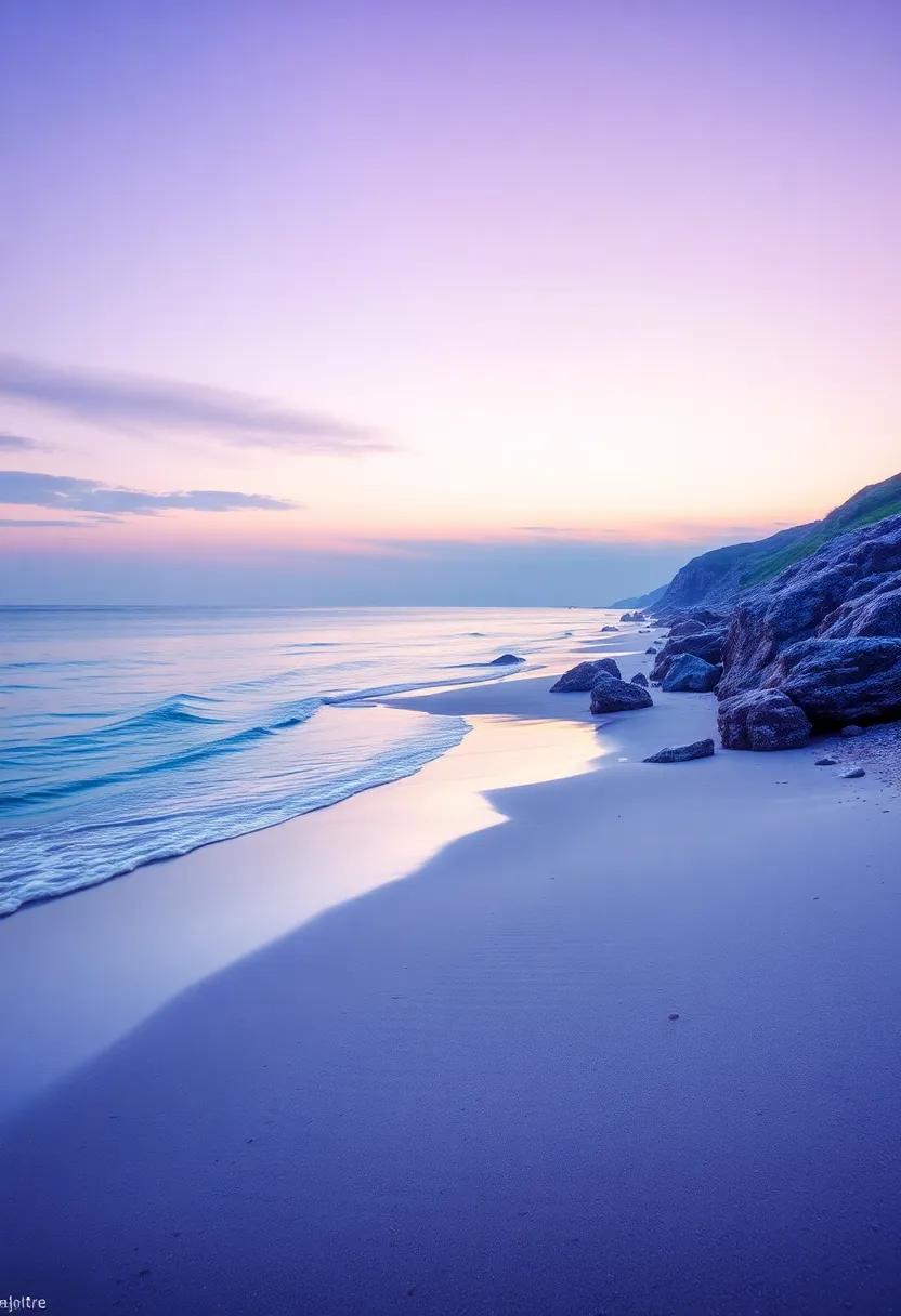 “Lavender Beaches”: A unique blend of soft purples and blues portrays a dreamlike scene of beaches at twilight, creating a soothing ambiance