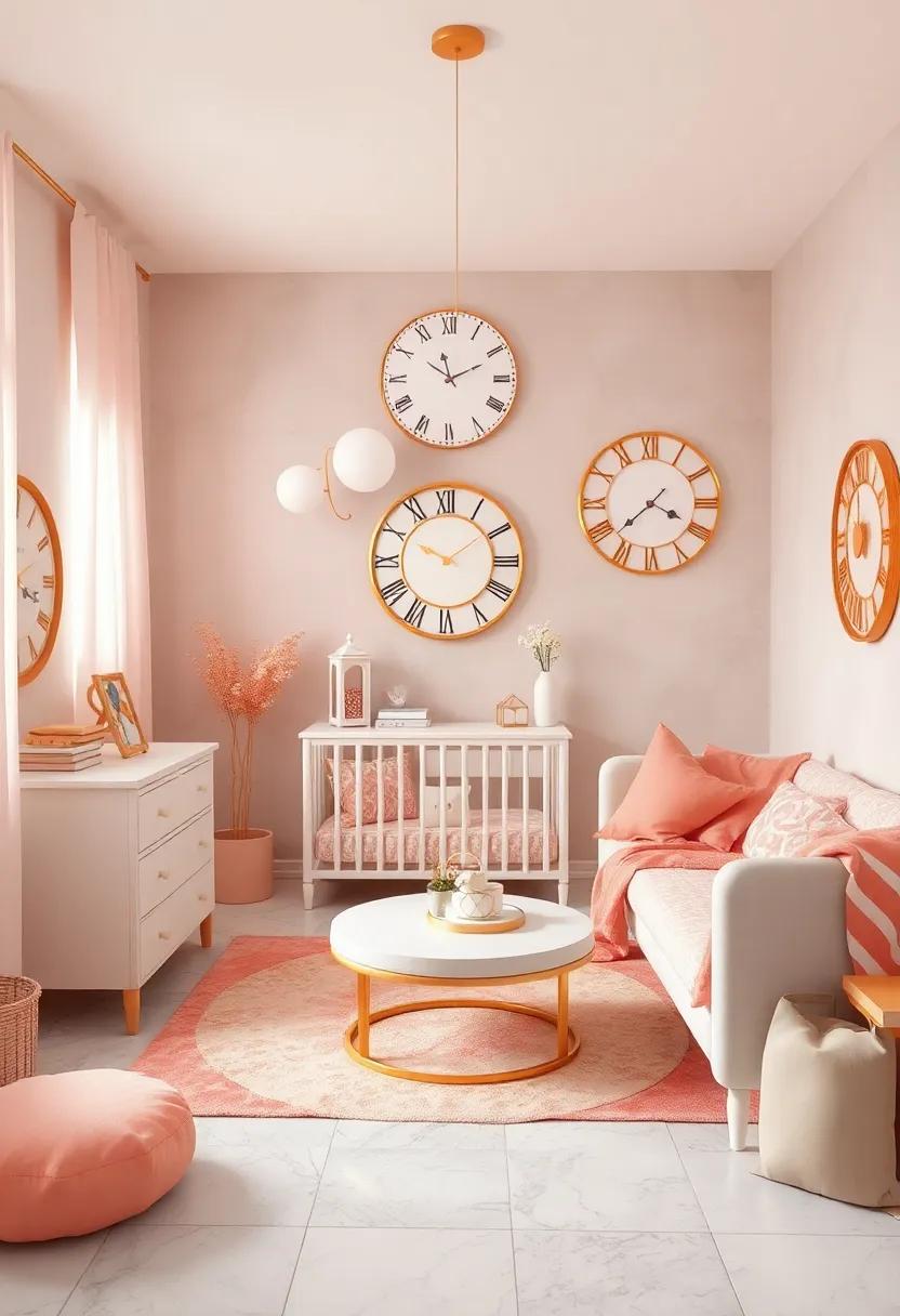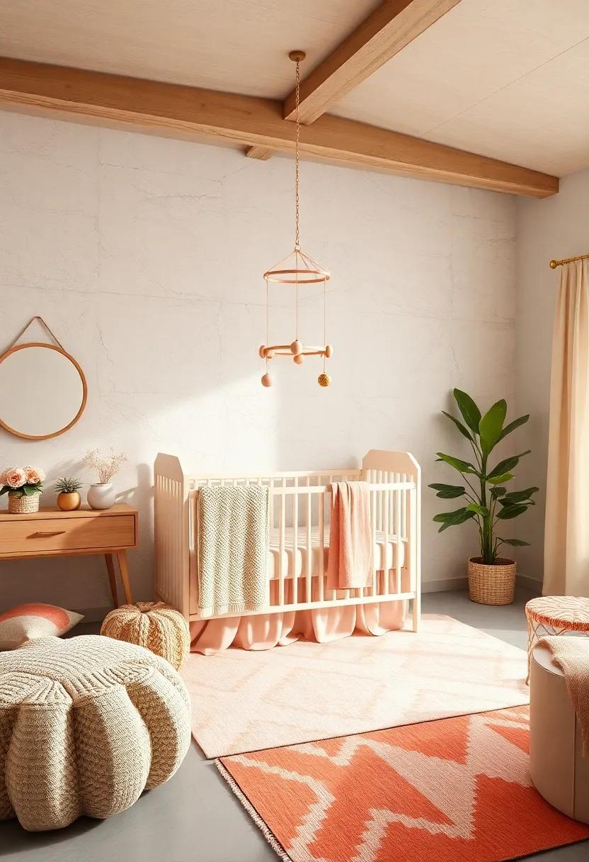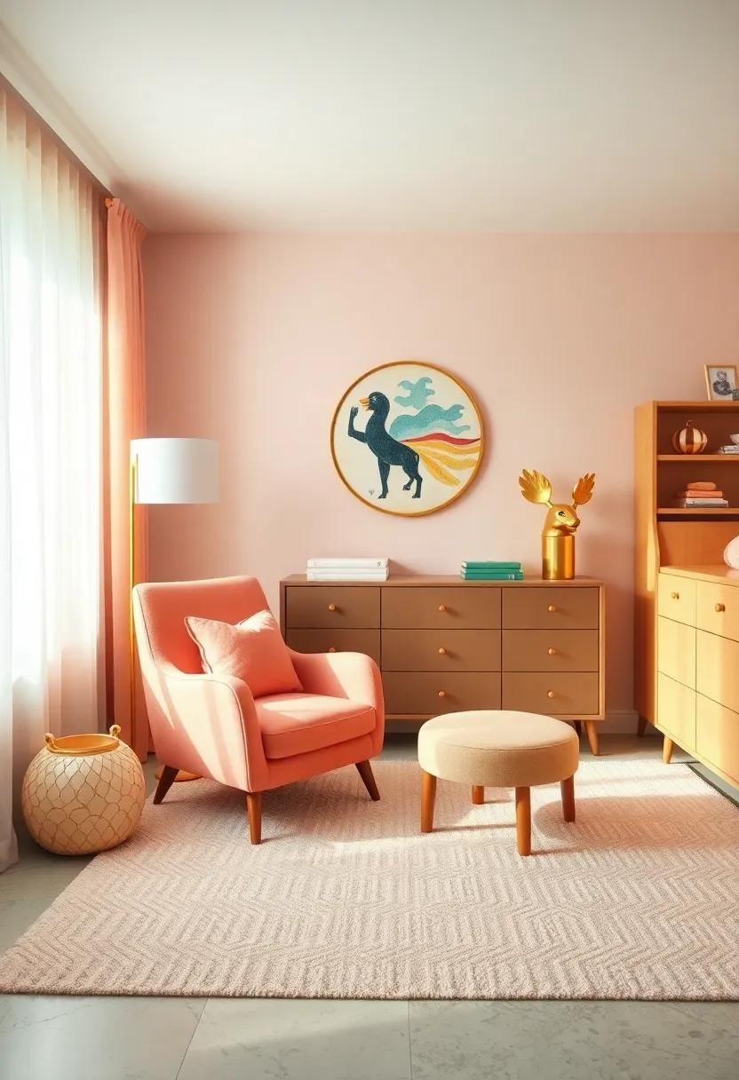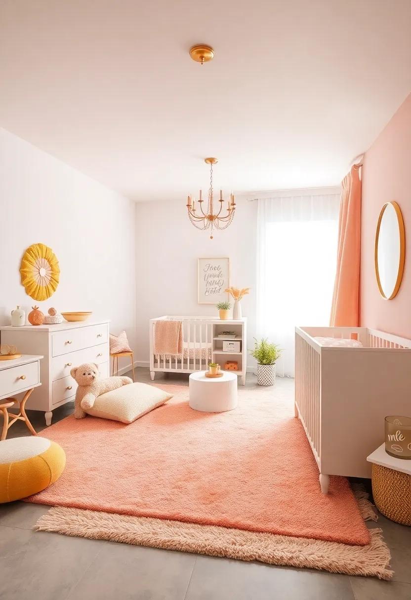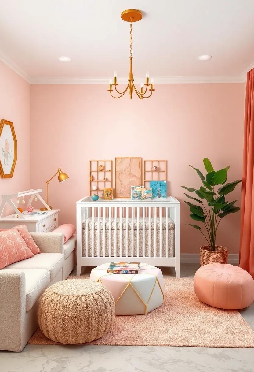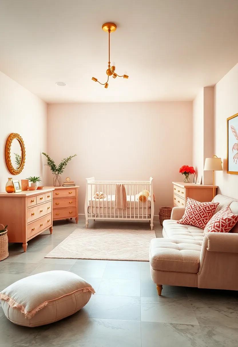 Unique Accent Chairs: Add a comfy accent chair with plush upholstery in peach tones, providing a cozy nook for reading or rocking your baby