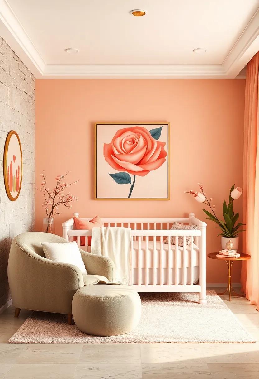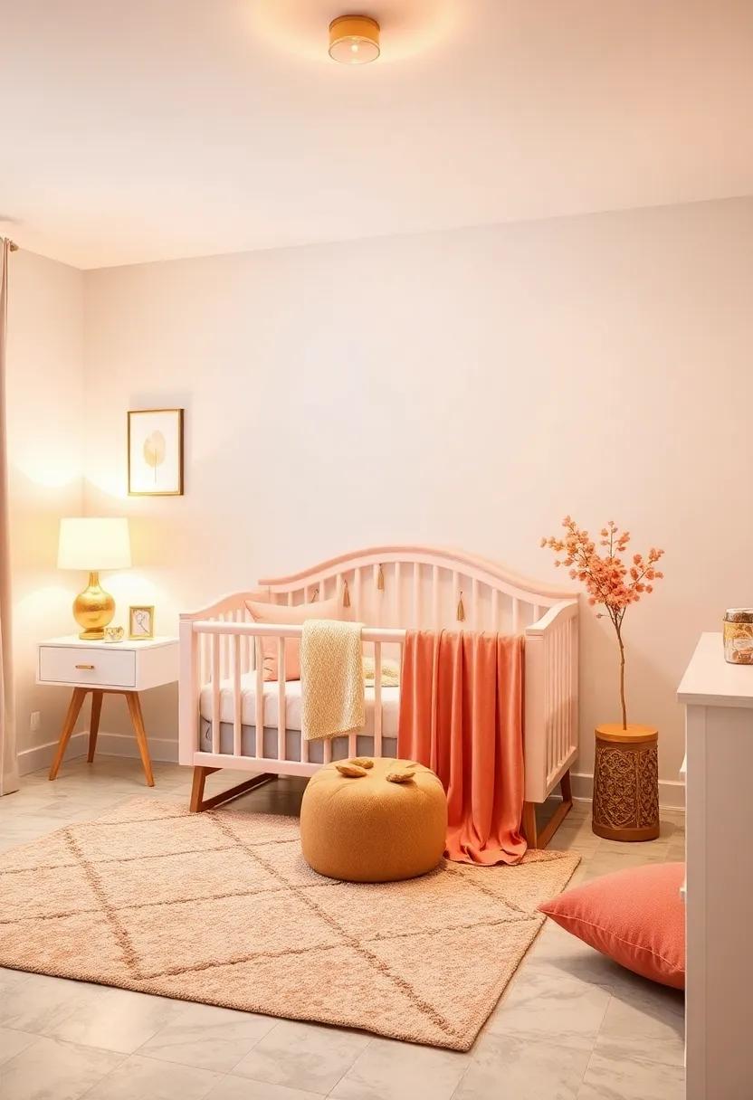 Incorporating a plush accent chair in soft peach upholstery into your nursery can transform an ordinary corner into a delightful reading nook. Gentle curves and inviting fabric create an inviting space that’s perfect for cozying up with a storybook or enjoying tender moments with your little one. Consider selecting a chair with a matching ottoman to enhance comfort and create an aesthetically pleasing setup. The warm peach tones not only provide a soothing backdrop but also serve as a lovely contrast against gold accents in your decor, tying the entire room together beautifully.