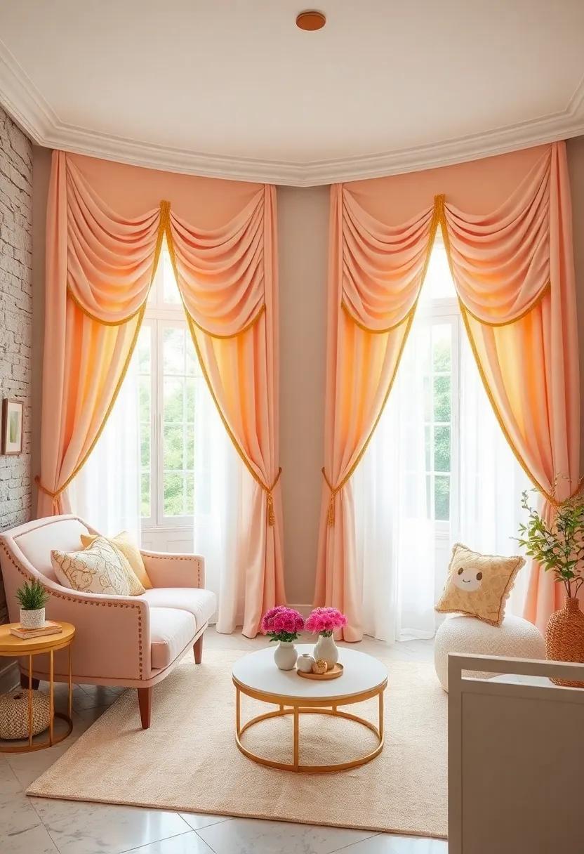 Cozy Textiles: Select bedding and cushions in soft fabrics featuring peach and gold patterns to ensure a cozy feel while tying the room together