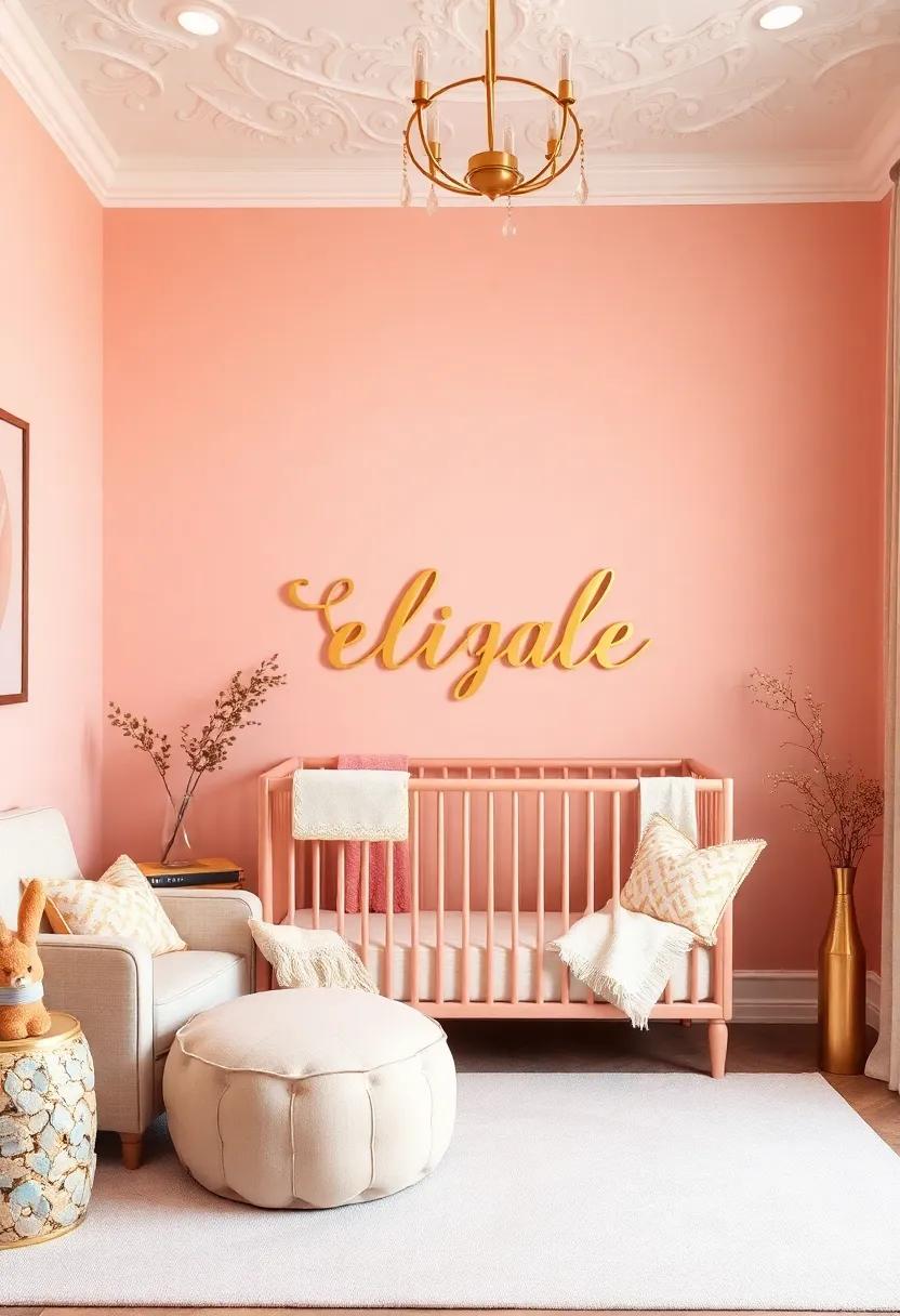 Personalized Name Sign: Decorate the nursery with a custom name sign in elegant gold lettering against a soft peach backdrop for a personal touch