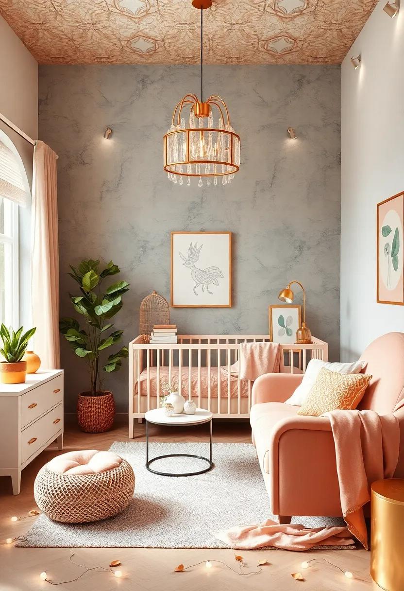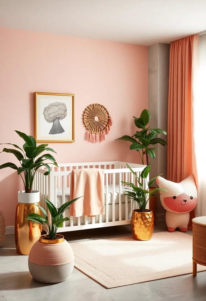 Bringing the beauty of the outdoors inside can create a vibrant and inviting atmosphere in your nursery.Consider incorporating elegant plants housed in gold pots to perfect the peach and gold theme. Not only do plants add a lively touch, but they also improve air quality and create a calming environment for both you and your little one. Choose a mix of succulents and small flowering plants that require minimal maintenance while fitting seamlessly into your decor.