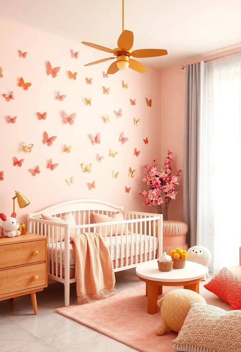 Whimsical Wall Decals: Choose playful wall decals in both peach and gold themes, such as butterflies or floral designs, to bring personality to the space