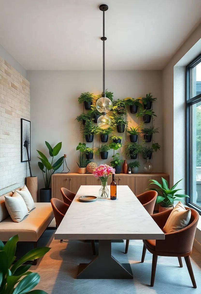 Customizing your vertical garden can be a creative endeavor. You might opt for a wall-mounted shelf system or even DIY your own planter with repurposed materials. To enhance the look, choose planters that complement your existing decor—think minimalist metal pots, natural wood holders, or sleek ceramic vessels. Experiment with various plant heights and colors to create a visually dynamic effect. Additionally, incorporating trailing plants can add a beautiful cascading effect, bringing an organic touch to your minimalist dining room.