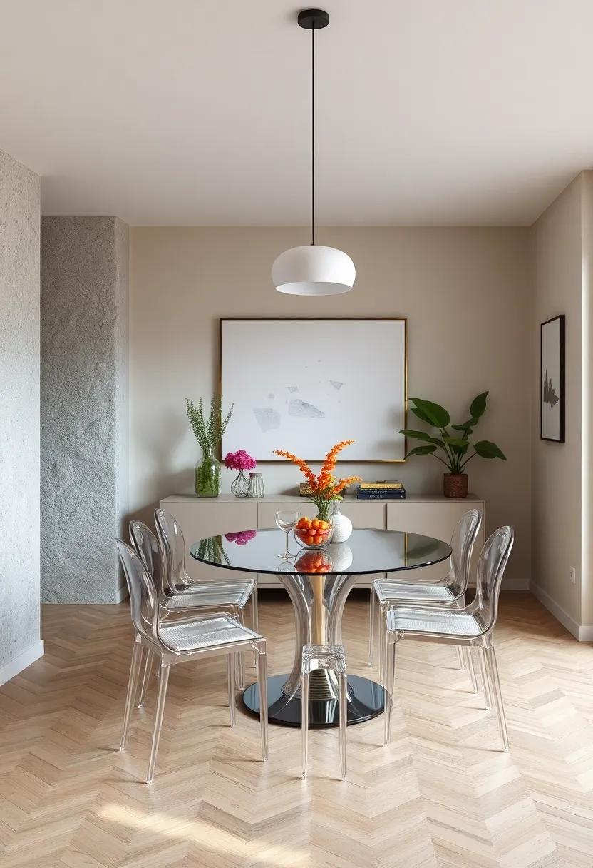 use Clear Furniture: Acrylic or glass dining chairs can visually expand your space, allowing light to pass through while maintaining a chic, modern look